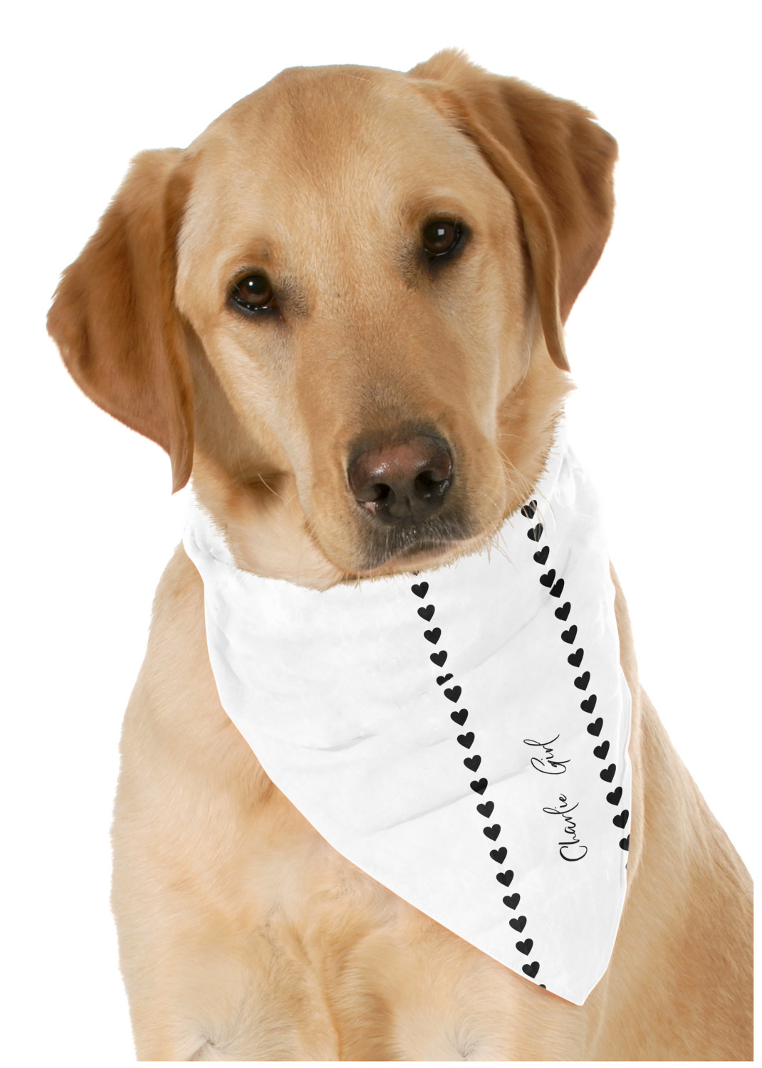 This beautiful pet bandana really is the perfect accessory. It is made from a silky feeling polyester and measures at approximately 23" x 23". Your personalization will be printed on a diagonal, so that you are able to read the personalization when folded into a triangle. This bandana fits best on large dogs, but can be folded smaller if there is no personalized text to fit smaller pets.