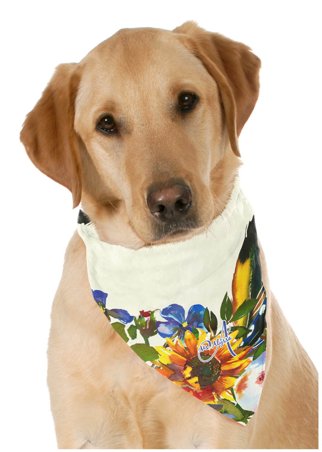 This beautiful pet bandana really is the perfect accessory. It is made from a silky feeling polyester and measures at approximately 23" x 23". Your personalization will be printed on a diagonal, so that you are able to read the personalization when folded into a triangle. This bandana fits best on large dogs, but can be folded smaller if there is no personalized text to fit smaller pets.