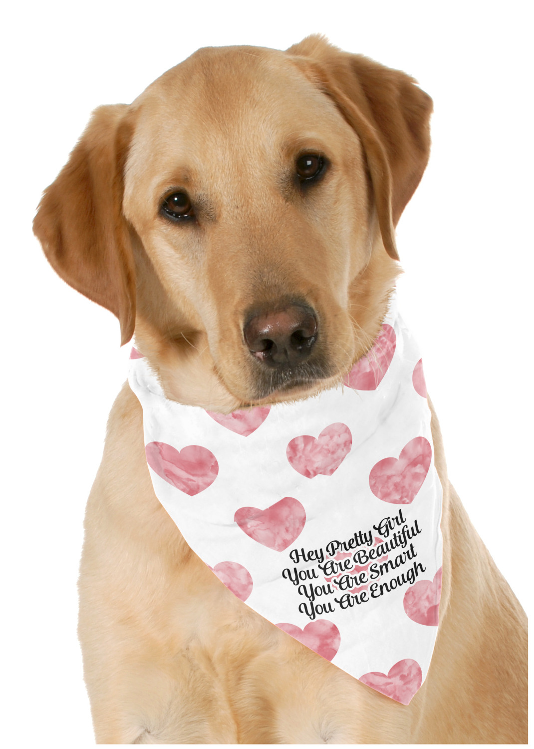 This beautiful pet bandana really is the perfect accessory. It is made from a silky feeling polyester and measures at approximately 23" x 23". Your personalization will be printed on a diagonal, so that you are able to read the personalization when folded into a triangle. This bandana fits best on large dogs, but can be folded smaller if there is no personalized text to fit smaller pets.
