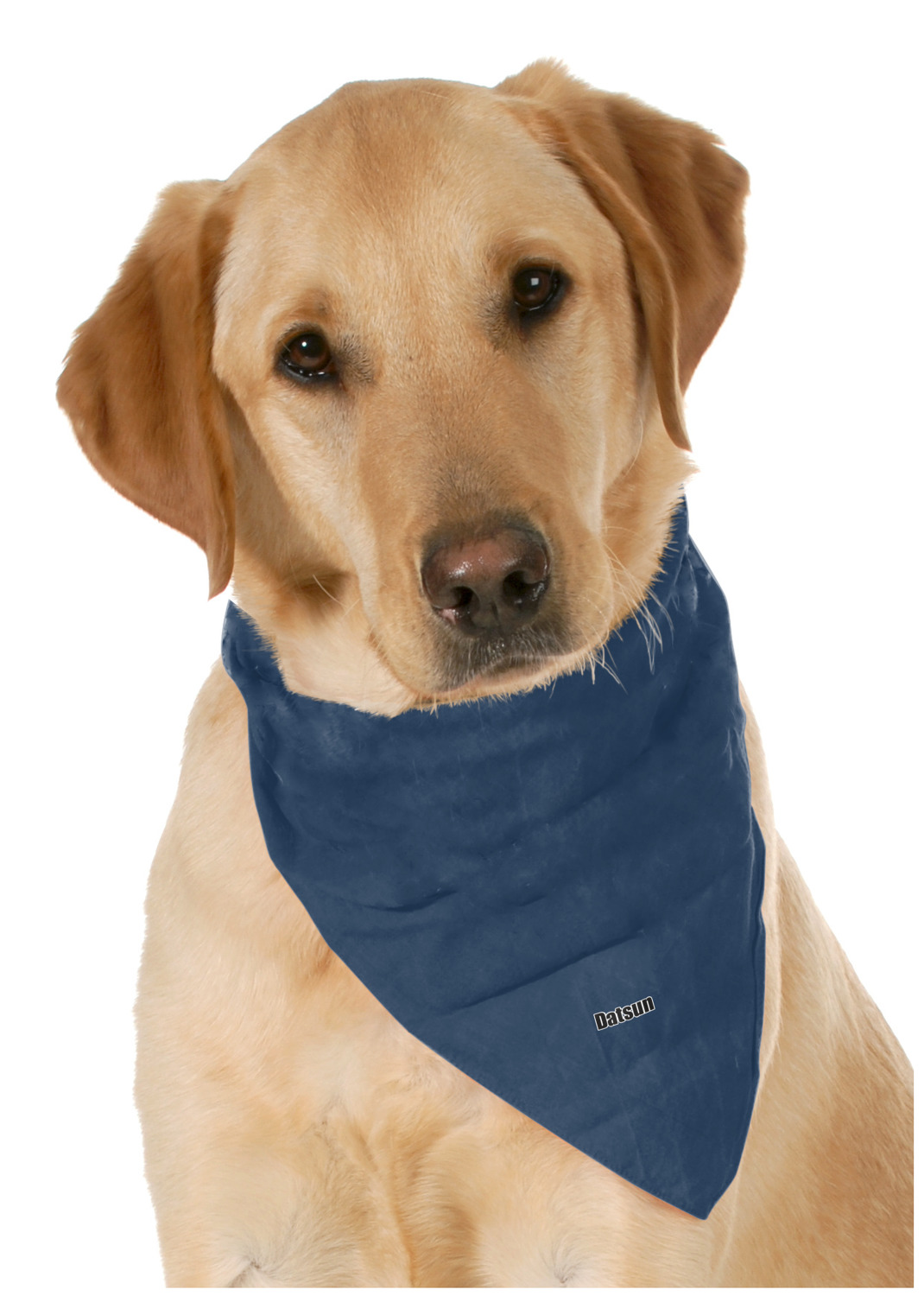 This beautiful pet bandana really is the perfect accessory. It is made from a silky feeling polyester and measures at approximately 23" x 23". Your personalization will be printed on a diagonal, so that you are able to read the personalization when folded into a triangle. This bandana fits best on large dogs, but can be folded smaller if there is no personalized text to fit smaller pets.