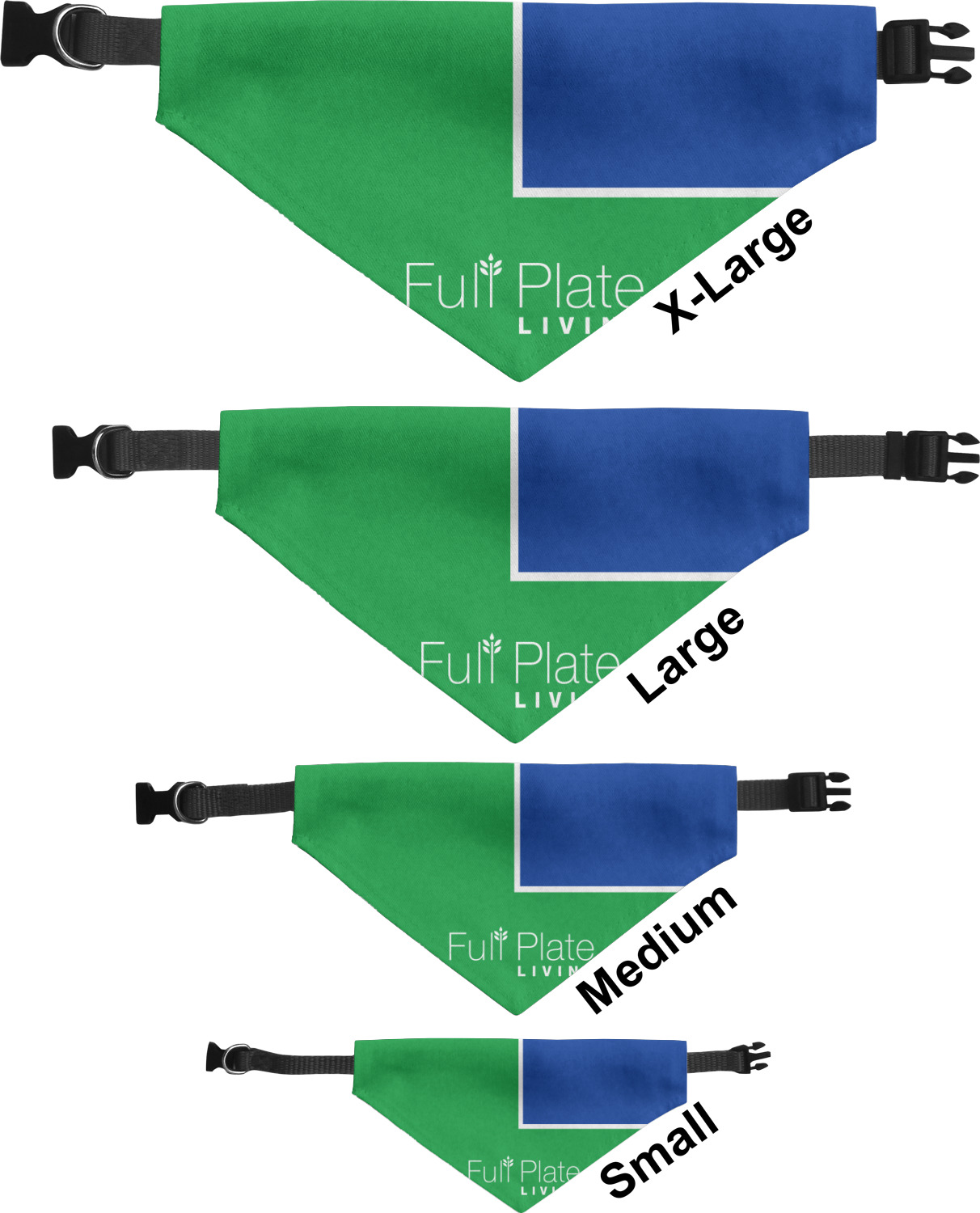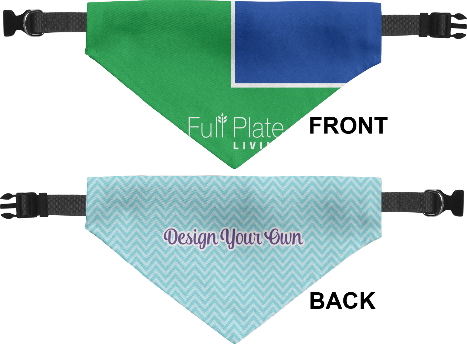 We print the front and back of these dog bandanas with your customized design. The bandana itself is made from a durable polyester, sewn together with a gap large enough to accommodate any collar. Regardless, the bandana includes a plain black, canvas collar with plastic snaps, that can easily be removed if desired. These dog bandana collars are available in four sizes: small, medium, large, and extra large. Please see our sizing chart for more information regarding the dimensions of each size.