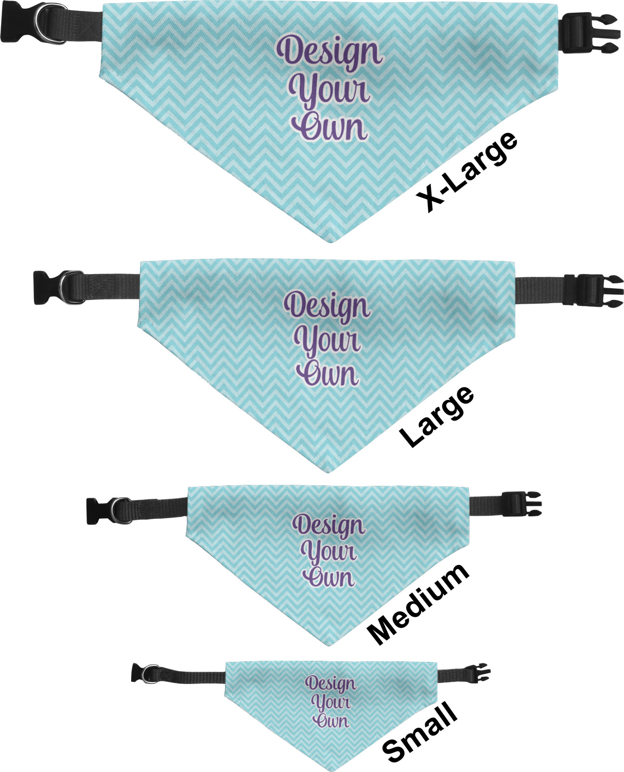 We print the front and back of these dog bandanas with your customized design. The bandana itself is made from a durable polyester, sewn together with a gap large enough to accommodate any collar. Regardless, the bandana includes a plain black, canvas collar with plastic snaps, that can easily be removed if desired. These dog bandana collars are available in four sizes: small, medium, large, and extra large. Please see our sizing chart for more information regarding the dimensions of each size.