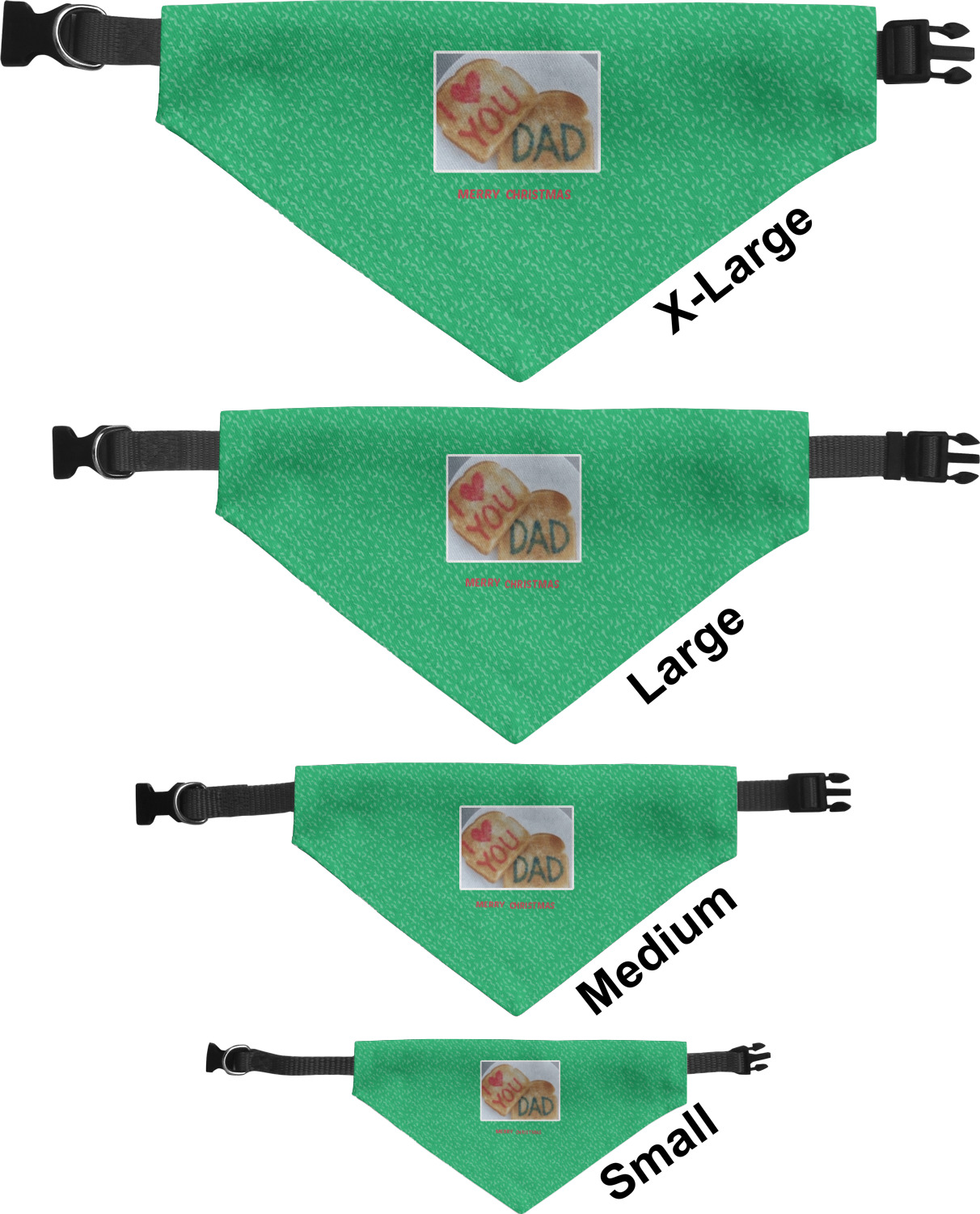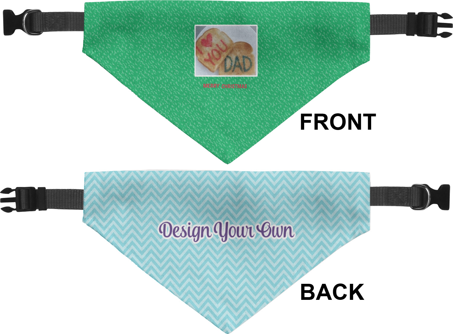 We print the front and back of these dog bandanas with your customized design. The bandana itself is made from a durable polyester, sewn together with a gap large enough to accommodate any collar. Regardless, the bandana includes a plain black, canvas collar with plastic snaps, that can easily be removed if desired. These dog bandana collars are available in four sizes: small, medium, large, and extra large. Please see our sizing chart for more information regarding the dimensions of each size.