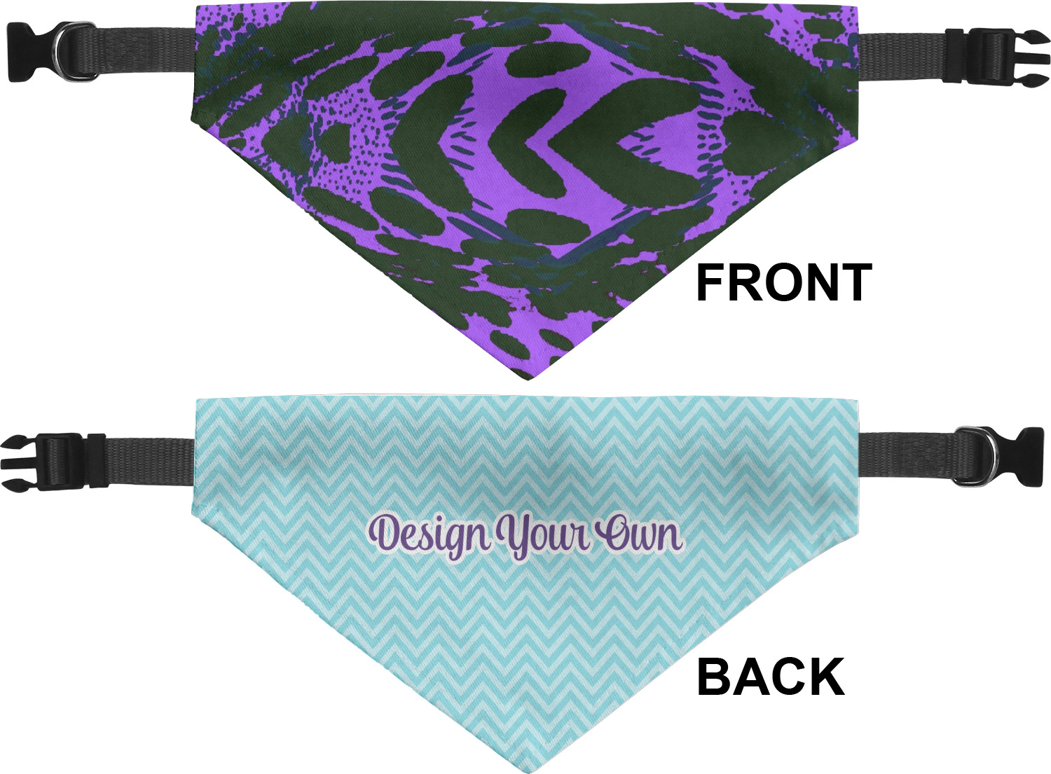 We print the front and back of these dog bandanas with your customized design. The bandana itself is made from a durable polyester, sewn together with a gap large enough to accommodate any collar. Regardless, the bandana includes a plain black, canvas collar with plastic snaps, that can easily be removed if desired. These dog bandana collars are available in four sizes: small, medium, large, and extra large. Please see our sizing chart for more information regarding the dimensions of each size.