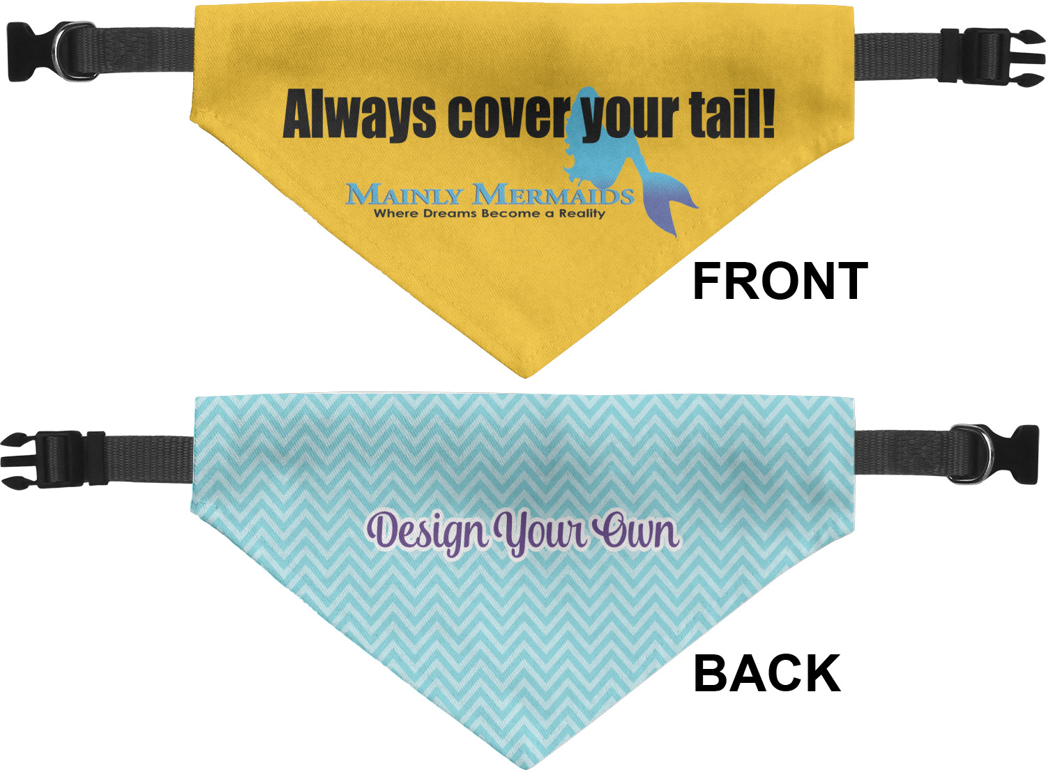 We print the front and back of these dog bandanas with your customized design. The bandana itself is made from a durable polyester, sewn together with a gap large enough to accommodate any collar. Regardless, the bandana includes a plain black, canvas collar with plastic snaps, that can easily be removed if desired. These dog bandana collars are available in four sizes: small, medium, large, and extra large. Please see our sizing chart for more information regarding the dimensions of each size.