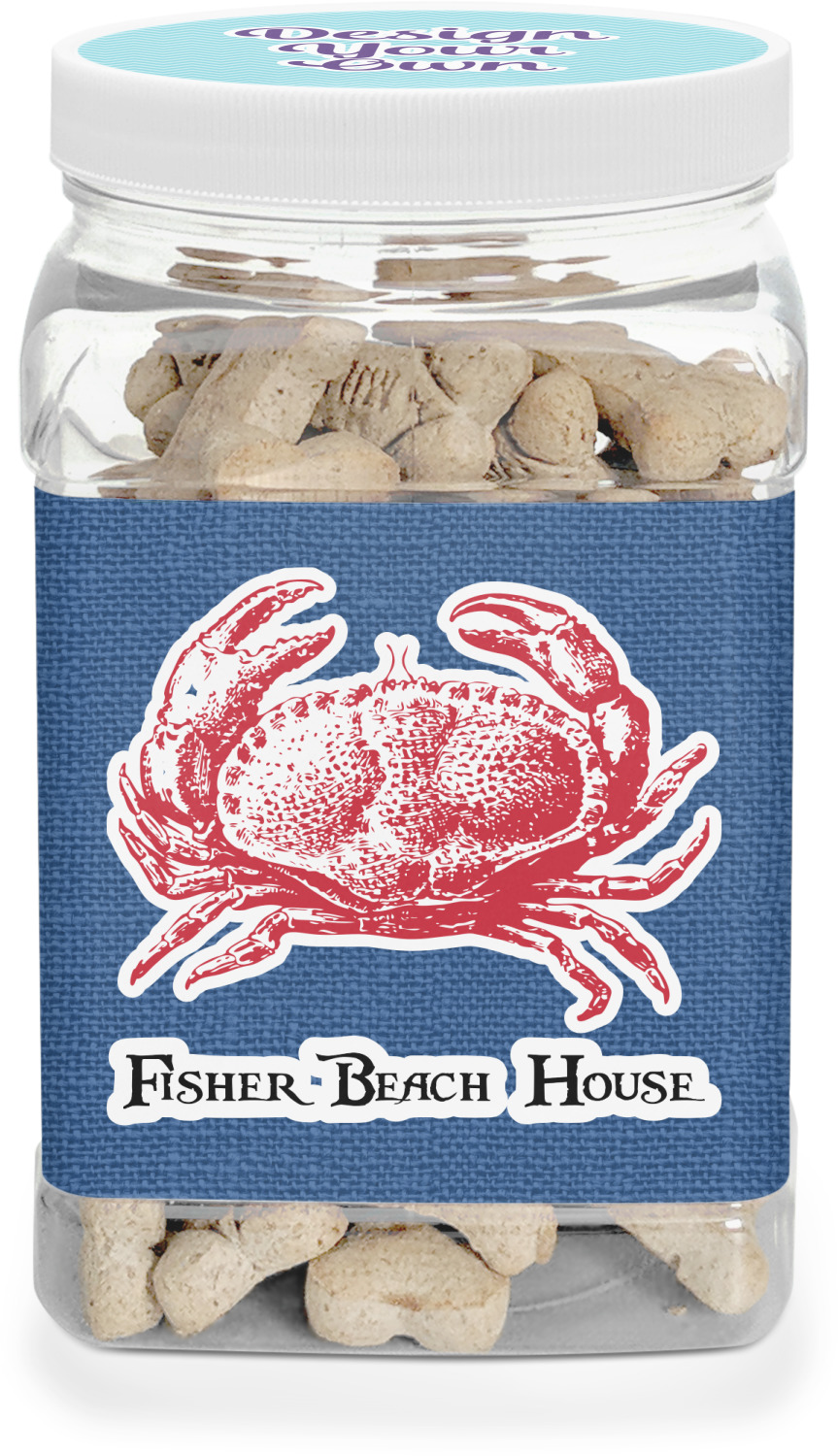 This half gallon jar, made from a sturdy plastic, is the perfect way to keep treats from any naughty pet paws, while still keeping them ready on hand for when your pup performs an impressive trick. This dog cookie jar features a screw-on, white lid that displays your personalized design on a vinyl sticker. We apply another customized sticker that wraps around the front and sides of the jar. Our dog treat jar also has indentations on the rear ends of the sides, which allows for convenient handling, and its square frame allows for easy storage.
