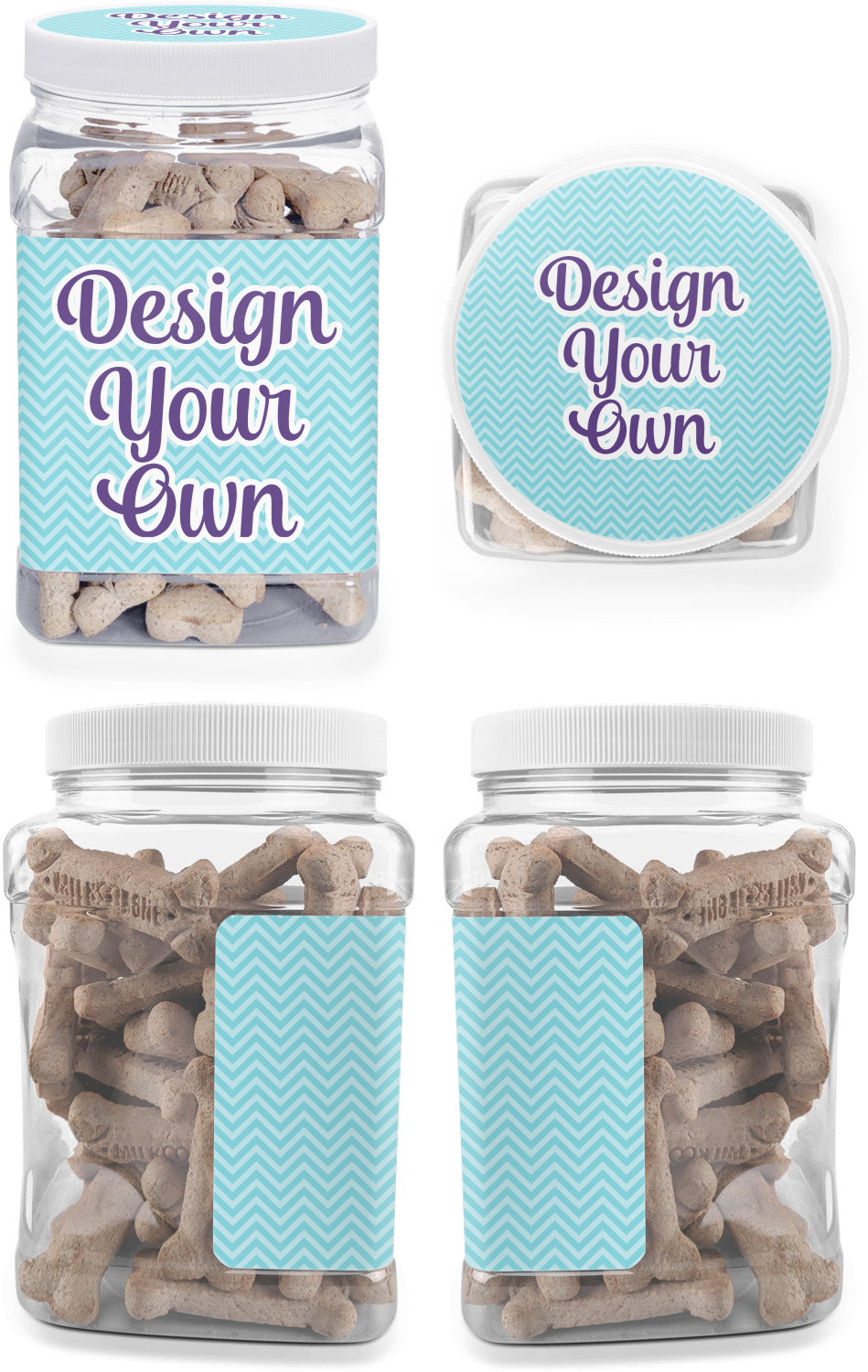 This half gallon jar, made from a sturdy plastic, is the perfect way to keep treats from any naughty pet paws, while still keeping them ready on hand for when your pup performs an impressive trick. This dog cookie jar features a screw-on, white lid that displays your personalized design on a vinyl sticker. We apply another customized sticker that wraps around the front and sides of the jar. Our dog treat jar also has indentations on the rear ends of the sides, which allows for convenient handling, and its square frame allows for easy storage.