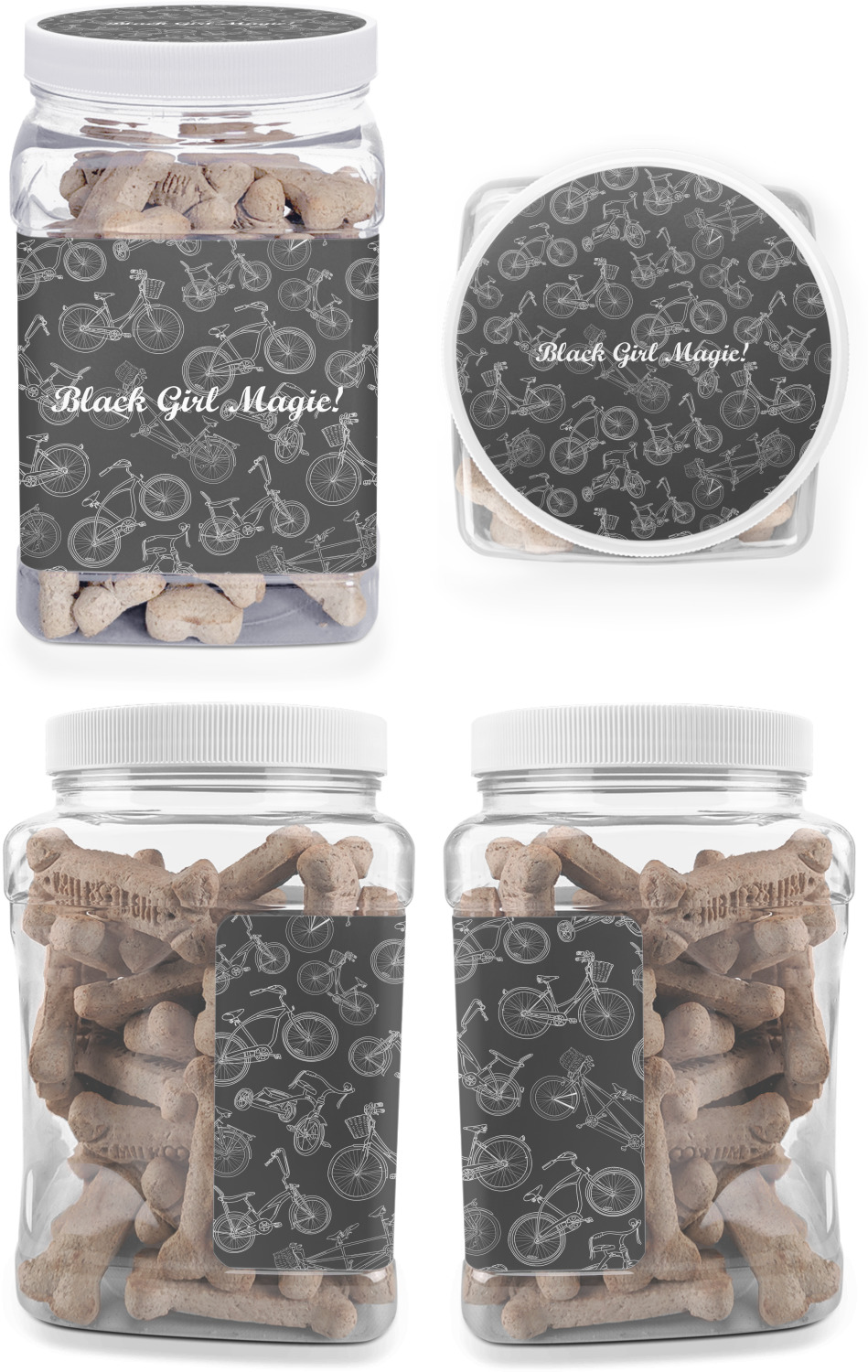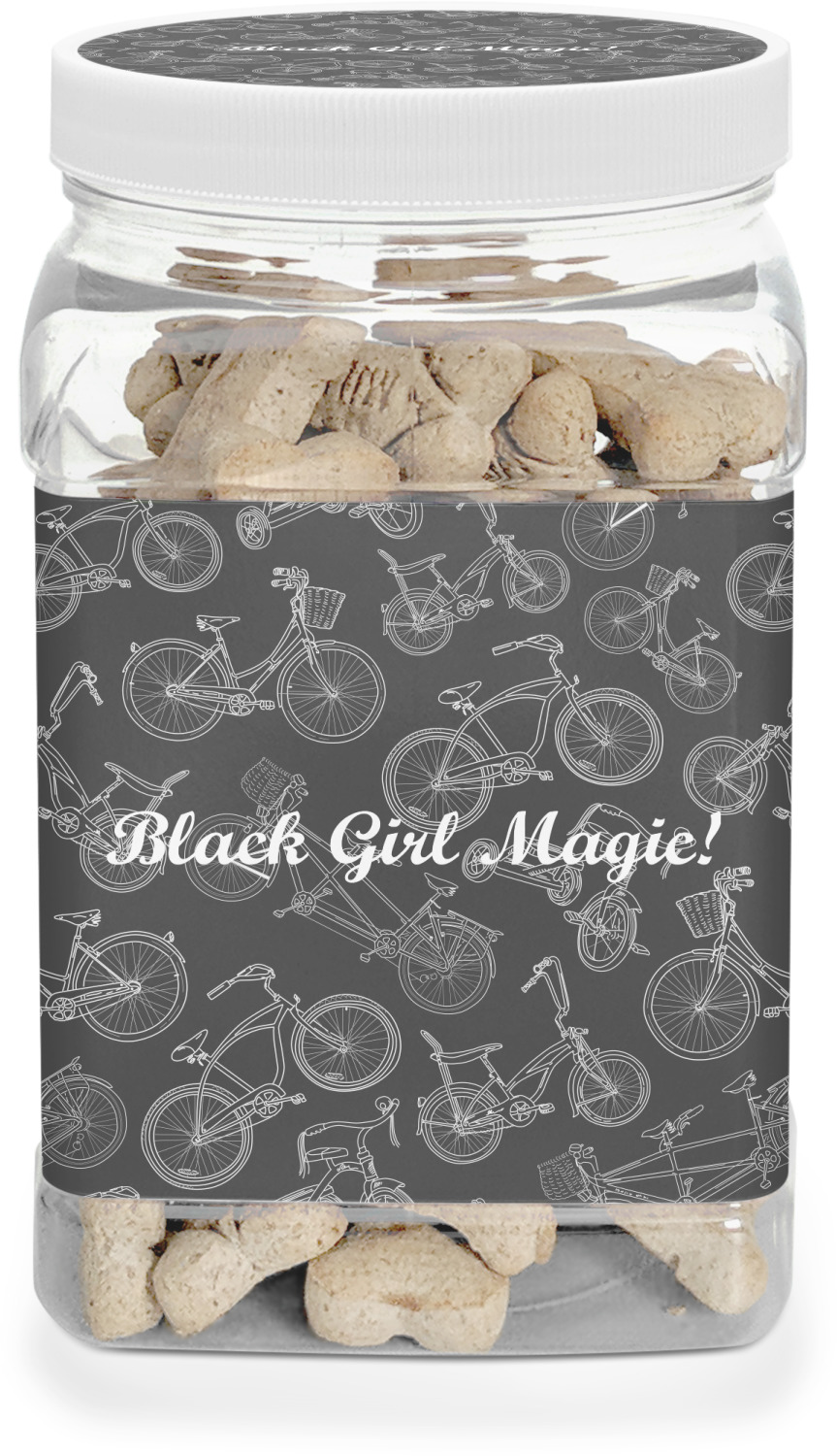 This half gallon jar, made from a sturdy plastic, is the perfect way to keep treats from any naughty pet paws, while still keeping them ready on hand for when your pup performs an impressive trick. This dog cookie jar features a screw-on, white lid that displays your personalized design on a vinyl sticker. We apply another customized sticker that wraps around the front and sides of the jar. Our dog treat jar also has indentations on the rear ends of the sides, which allows for convenient handling, and its square frame allows for easy storage.