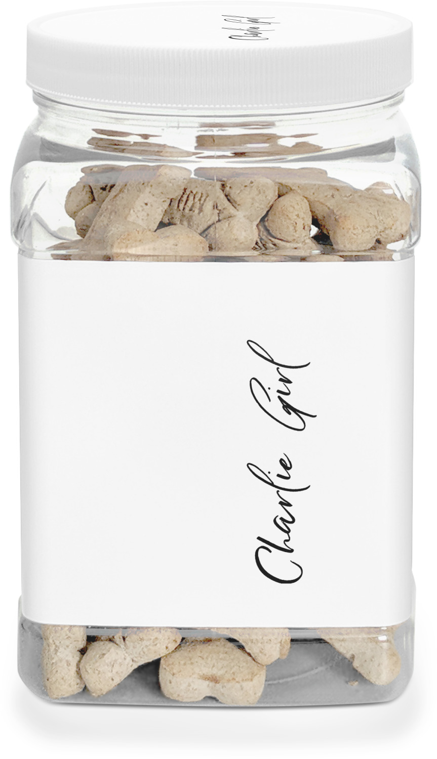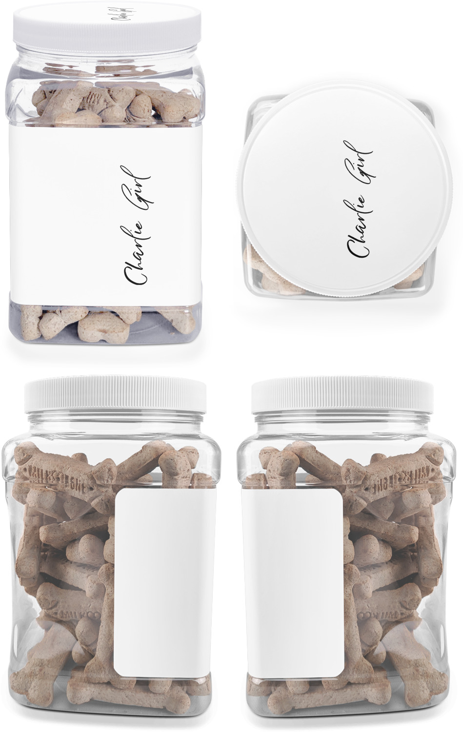 This half gallon jar, made from a sturdy plastic, is the perfect way to keep treats from any naughty pet paws, while still keeping them ready on hand for when your pup performs an impressive trick. This dog cookie jar features a screw-on, white lid that displays your personalized design on a vinyl sticker. We apply another customized sticker that wraps around the front and sides of the jar. Our dog treat jar also has indentations on the rear ends of the sides, which allows for convenient handling, and its square frame allows for easy storage.