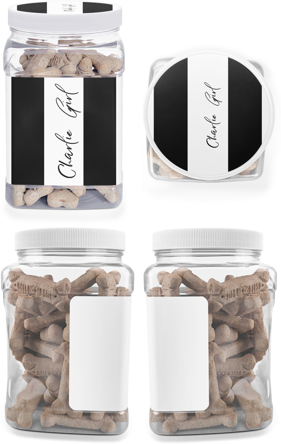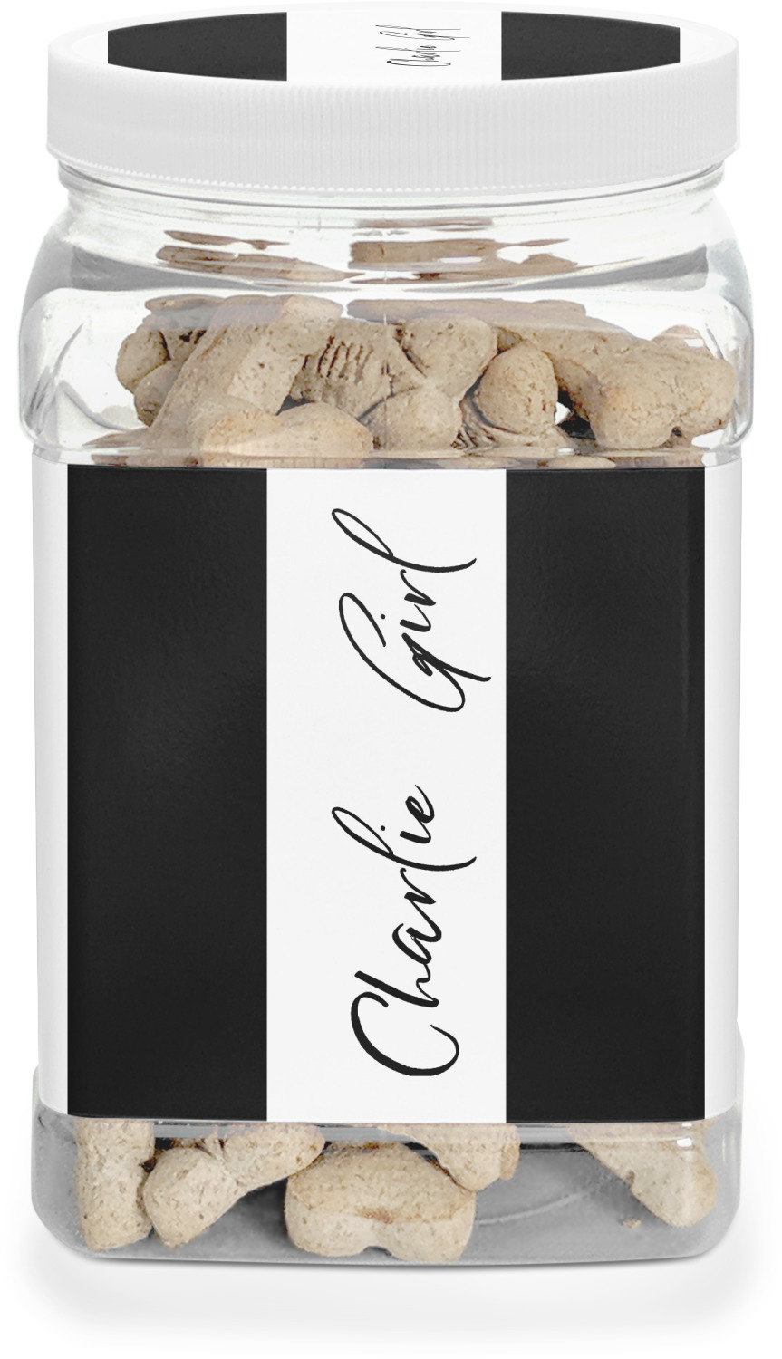 This half gallon jar, made from a sturdy plastic, is the perfect way to keep treats from any naughty pet paws, while still keeping them ready on hand for when your pup performs an impressive trick. This dog cookie jar features a screw-on, white lid that displays your personalized design on a vinyl sticker. We apply another customized sticker that wraps around the front and sides of the jar. Our dog treat jar also has indentations on the rear ends of the sides, which allows for convenient handling, and its square frame allows for easy storage.