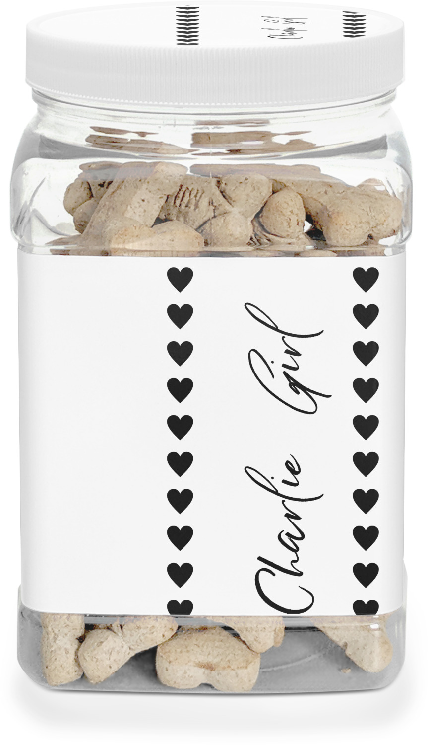 This half gallon jar, made from a sturdy plastic, is the perfect way to keep treats from any naughty pet paws, while still keeping them ready on hand for when your pup performs an impressive trick. This dog cookie jar features a screw-on, white lid that displays your personalized design on a vinyl sticker. We apply another customized sticker that wraps around the front and sides of the jar. Our dog treat jar also has indentations on the rear ends of the sides, which allows for convenient handling, and its square frame allows for easy storage.