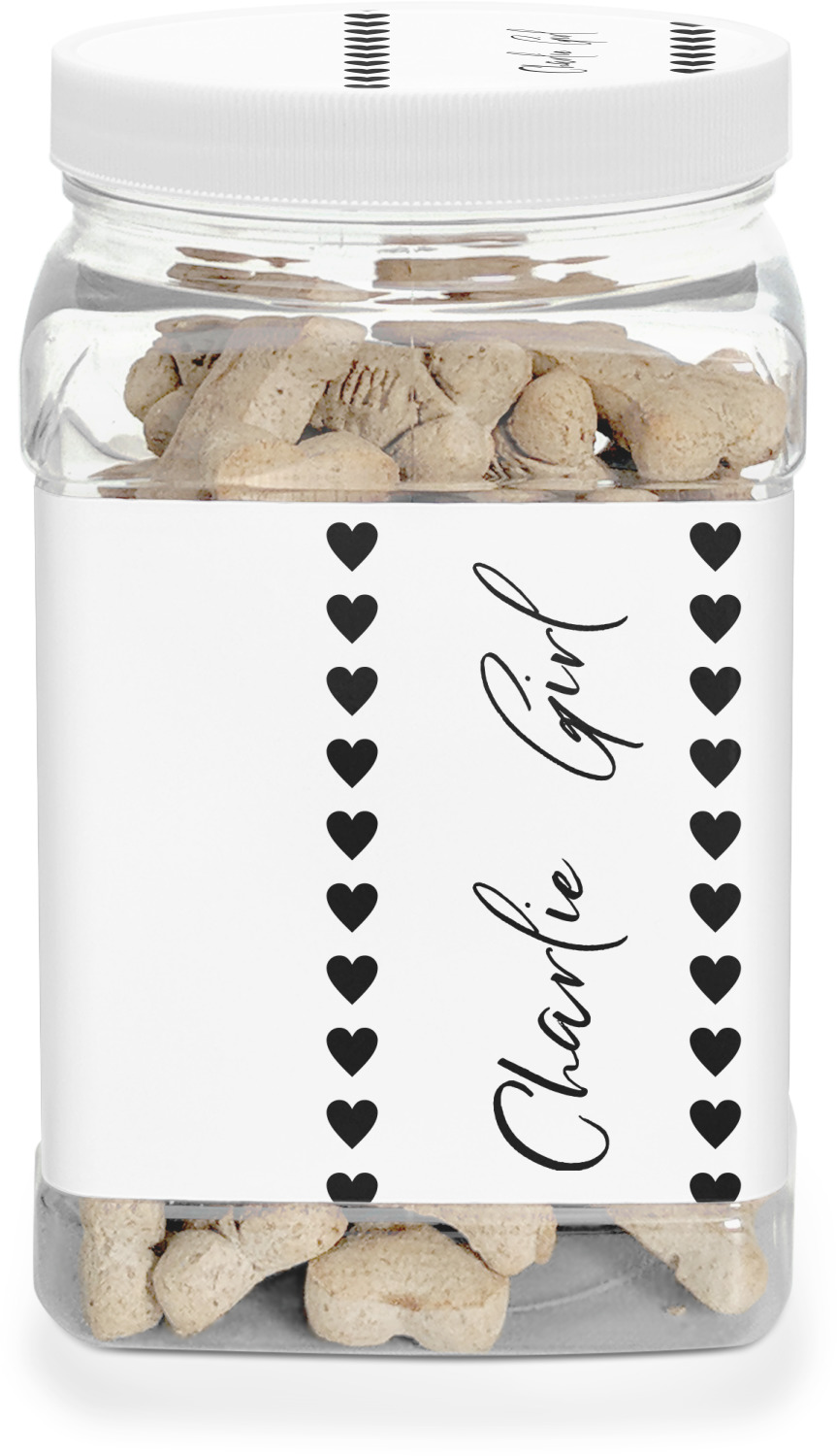 This half gallon jar, made from a sturdy plastic, is the perfect way to keep treats from any naughty pet paws, while still keeping them ready on hand for when your pup performs an impressive trick. This dog cookie jar features a screw-on, white lid that displays your personalized design on a vinyl sticker. We apply another customized sticker that wraps around the front and sides of the jar. Our dog treat jar also has indentations on the rear ends of the sides, which allows for convenient handling, and its square frame allows for easy storage.