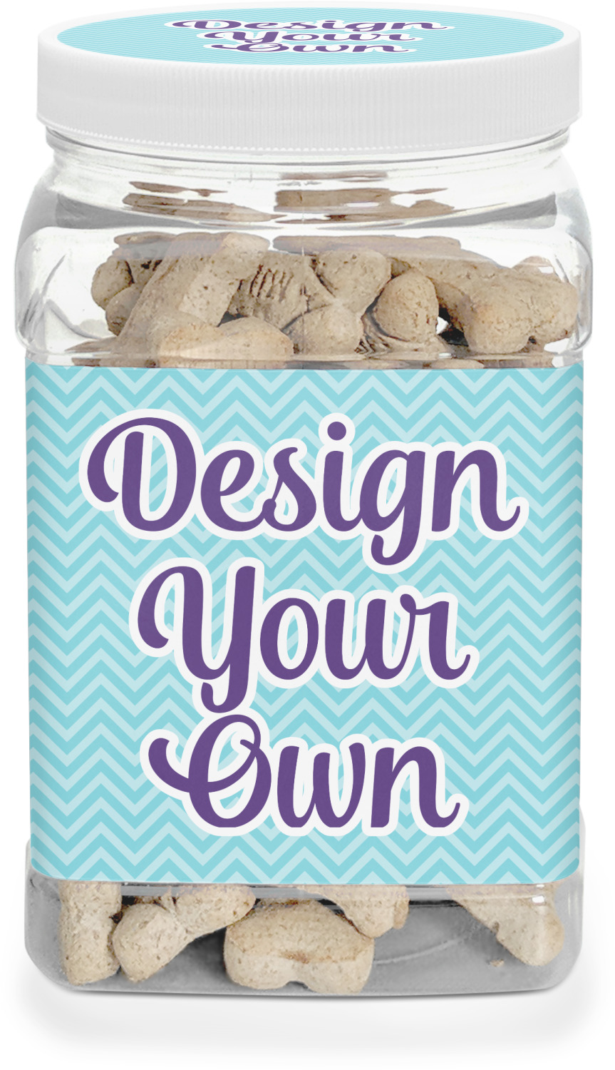 This half gallon jar, made from a sturdy plastic, is the perfect way to keep treats from any naughty pet paws, while still keeping them ready on hand for when your pup performs an impressive trick. This dog cookie jar features a screw-on, white lid that displays your personalized design on a vinyl sticker. We apply another customized sticker that wraps around the front and sides of the jar. Our dog treat jar also has indentations on the rear ends of the sides, which allows for convenient handling, and its square frame allows for easy storage.