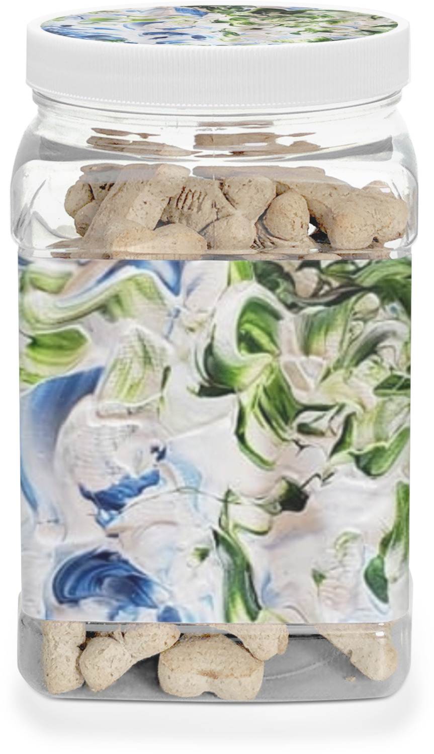 This half gallon jar, made from a sturdy plastic, is the perfect way to keep treats from any naughty pet paws, while still keeping them ready on hand for when your pup performs an impressive trick. This dog cookie jar features a screw-on, white lid that displays your personalized design on a vinyl sticker. We apply another customized sticker that wraps around the front and sides of the jar. Our dog treat jar also has indentations on the rear ends of the sides, which allows for convenient handling, and its square frame allows for easy storage.