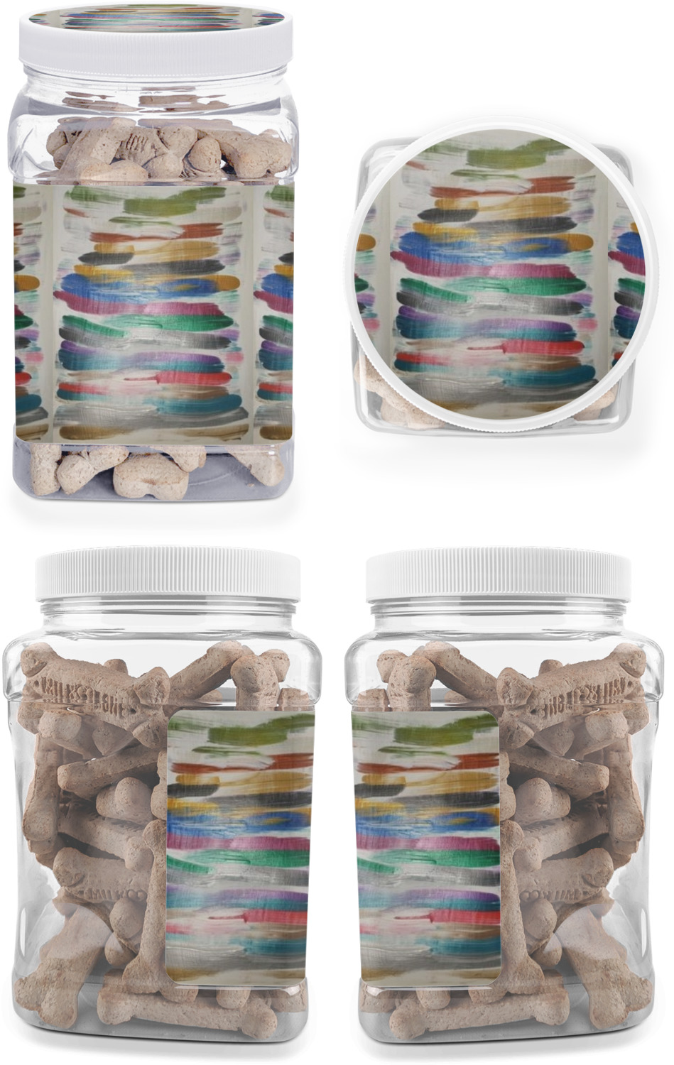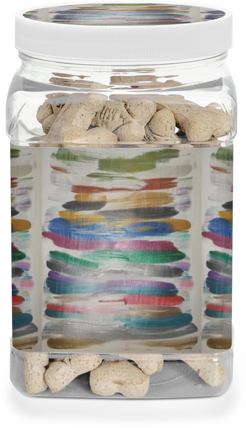 This half gallon jar, made from a sturdy plastic, is the perfect way to keep treats from any naughty pet paws, while still keeping them ready on hand for when your pup performs an impressive trick. This dog cookie jar features a screw-on, white lid that displays your personalized design on a vinyl sticker. We apply another customized sticker that wraps around the front and sides of the jar. Our dog treat jar also has indentations on the rear ends of the sides, which allows for convenient handling, and its square frame allows for easy storage.