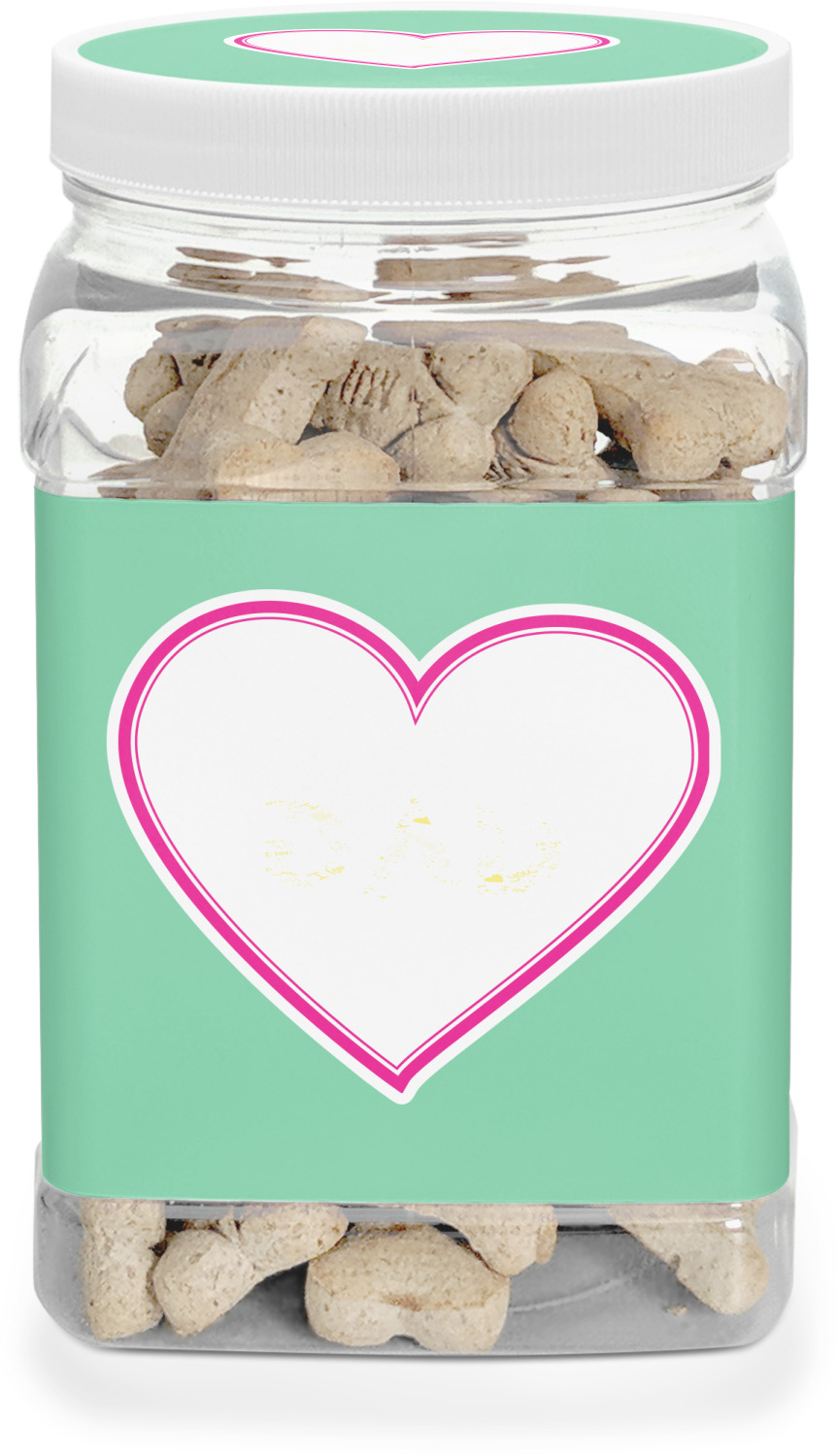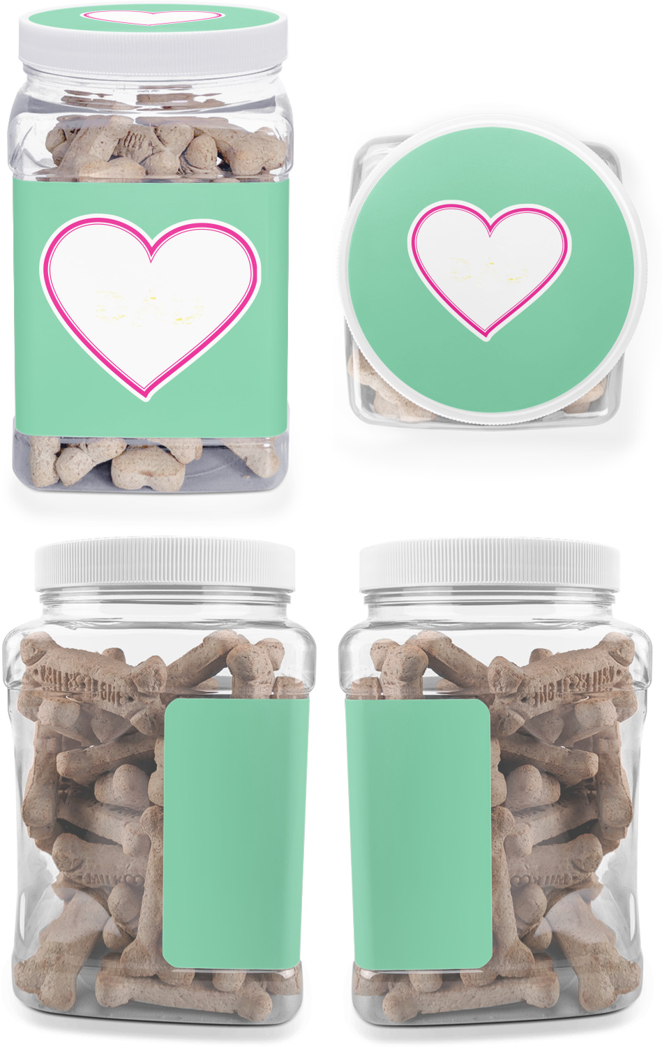 This half gallon jar, made from a sturdy plastic, is the perfect way to keep treats from any naughty pet paws, while still keeping them ready on hand for when your pup performs an impressive trick. This dog cookie jar features a screw-on, white lid that displays your personalized design on a vinyl sticker. We apply another customized sticker that wraps around the front and sides of the jar. Our dog treat jar also has indentations on the rear ends of the sides, which allows for convenient handling, and its square frame allows for easy storage.