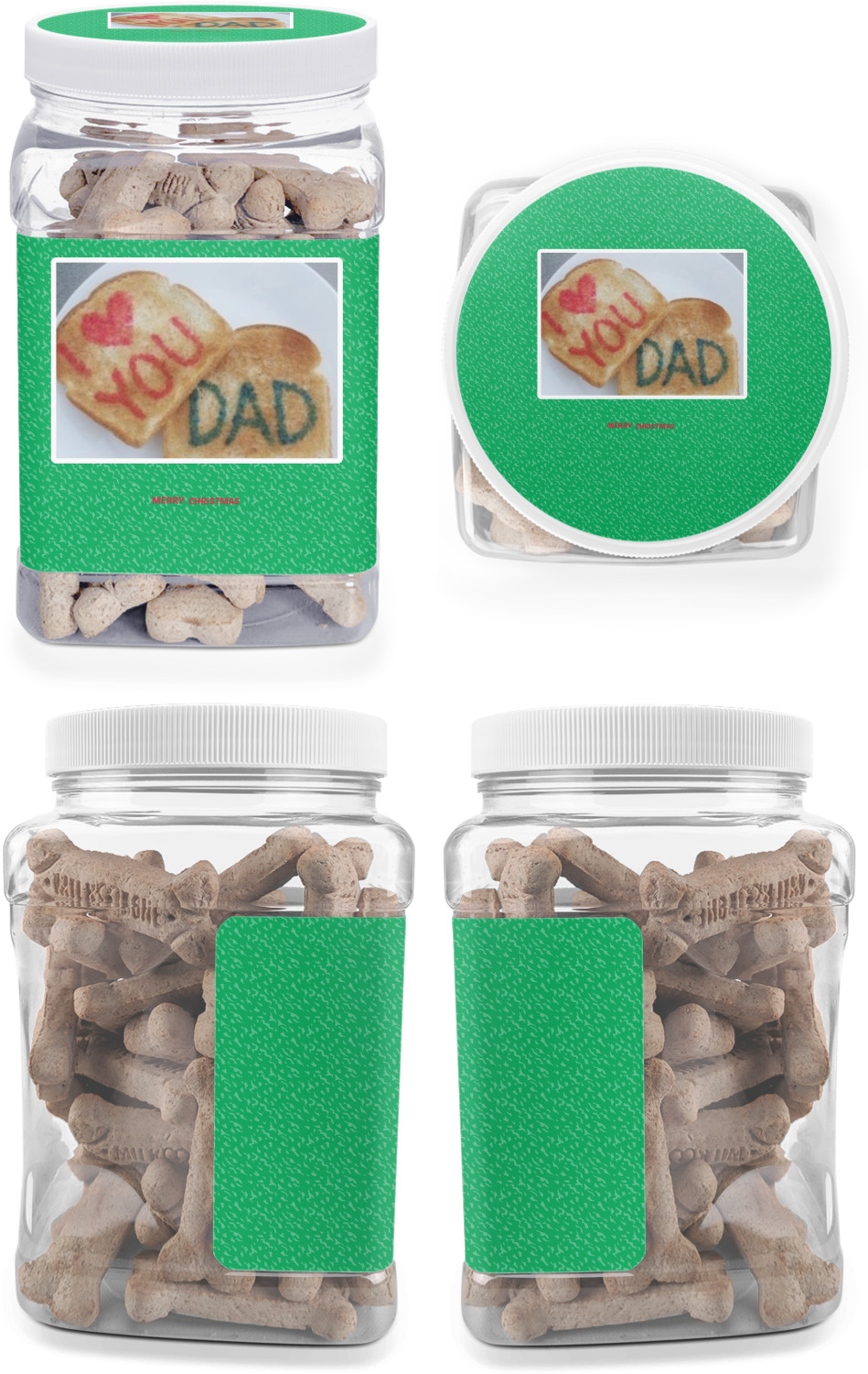 This half gallon jar, made from a sturdy plastic, is the perfect way to keep treats from any naughty pet paws, while still keeping them ready on hand for when your pup performs an impressive trick. This dog cookie jar features a screw-on, white lid that displays your personalized design on a vinyl sticker. We apply another customized sticker that wraps around the front and sides of the jar. Our dog treat jar also has indentations on the rear ends of the sides, which allows for convenient handling, and its square frame allows for easy storage.