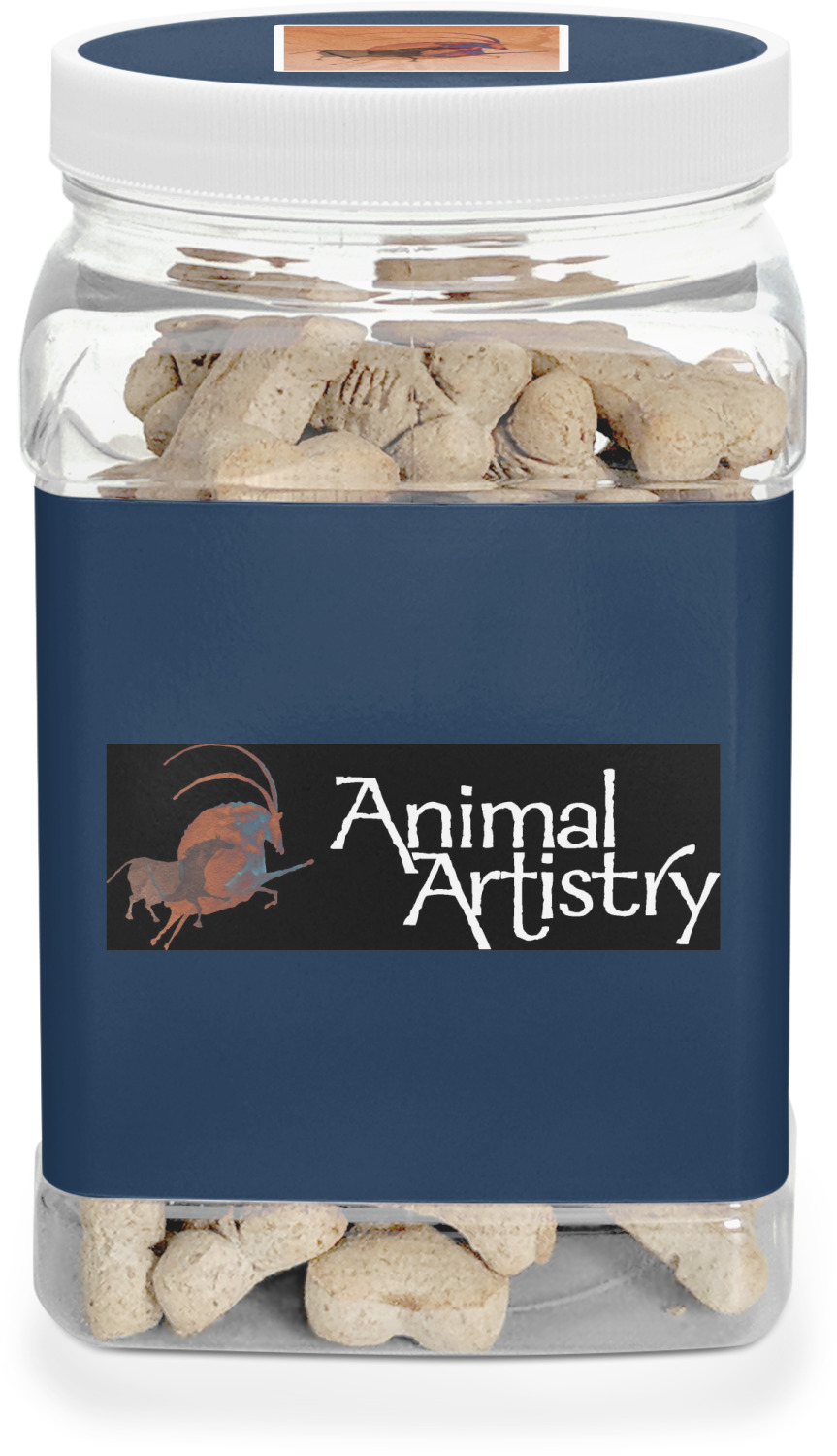 This half gallon jar, made from a sturdy plastic, is the perfect way to keep treats from any naughty pet paws, while still keeping them ready on hand for when your pup performs an impressive trick. This dog cookie jar features a screw-on, white lid that displays your personalized design on a vinyl sticker. We apply another customized sticker that wraps around the front and sides of the jar. Our dog treat jar also has indentations on the rear ends of the sides, which allows for convenient handling, and its square frame allows for easy storage.