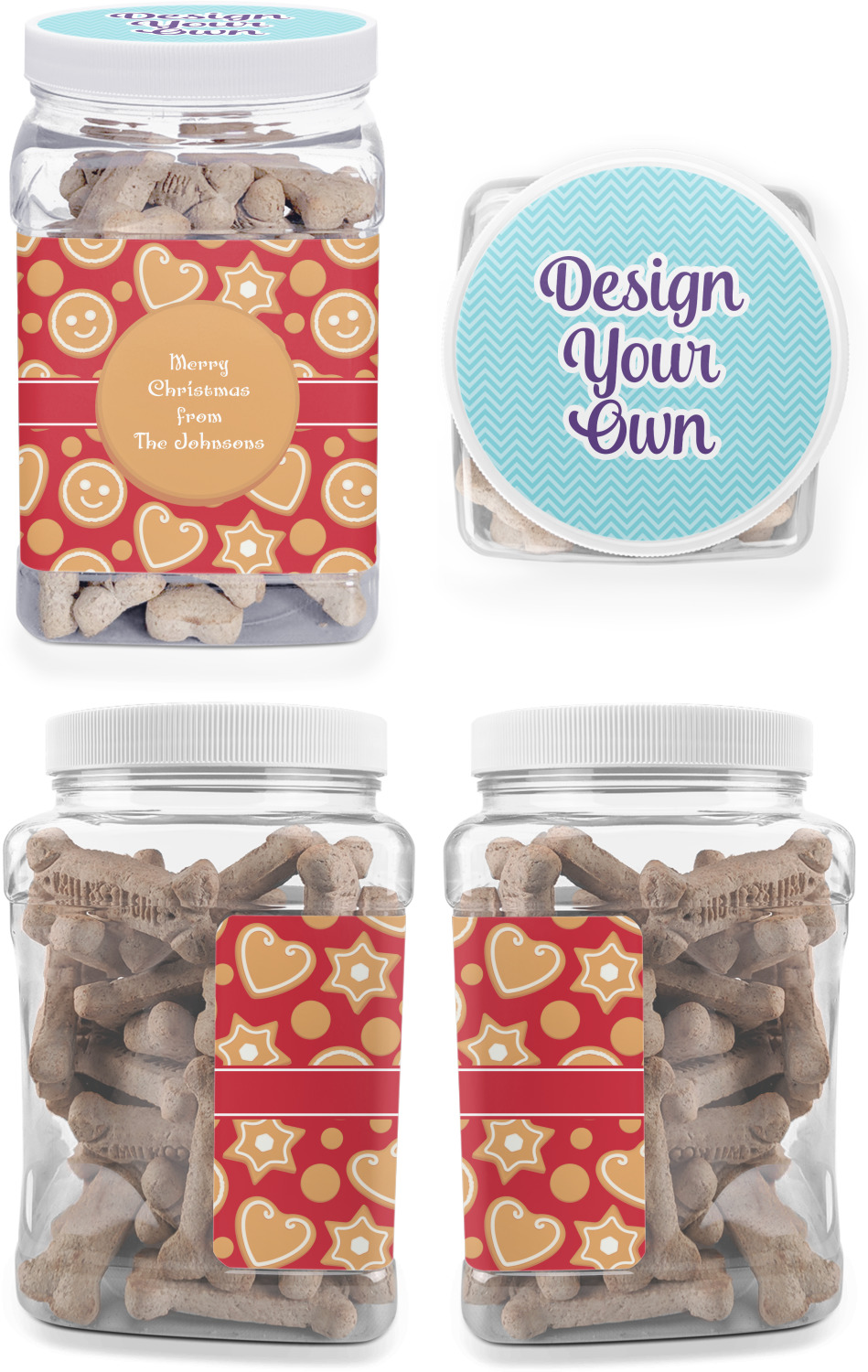 This half gallon jar, made from a sturdy plastic, is the perfect way to keep treats from any naughty pet paws, while still keeping them ready on hand for when your pup performs an impressive trick. This dog cookie jar features a screw-on, white lid that displays your personalized design on a vinyl sticker. We apply another customized sticker that wraps around the front and sides of the jar. Our dog treat jar also has indentations on the rear ends of the sides, which allows for convenient handling, and its square frame allows for easy storage.