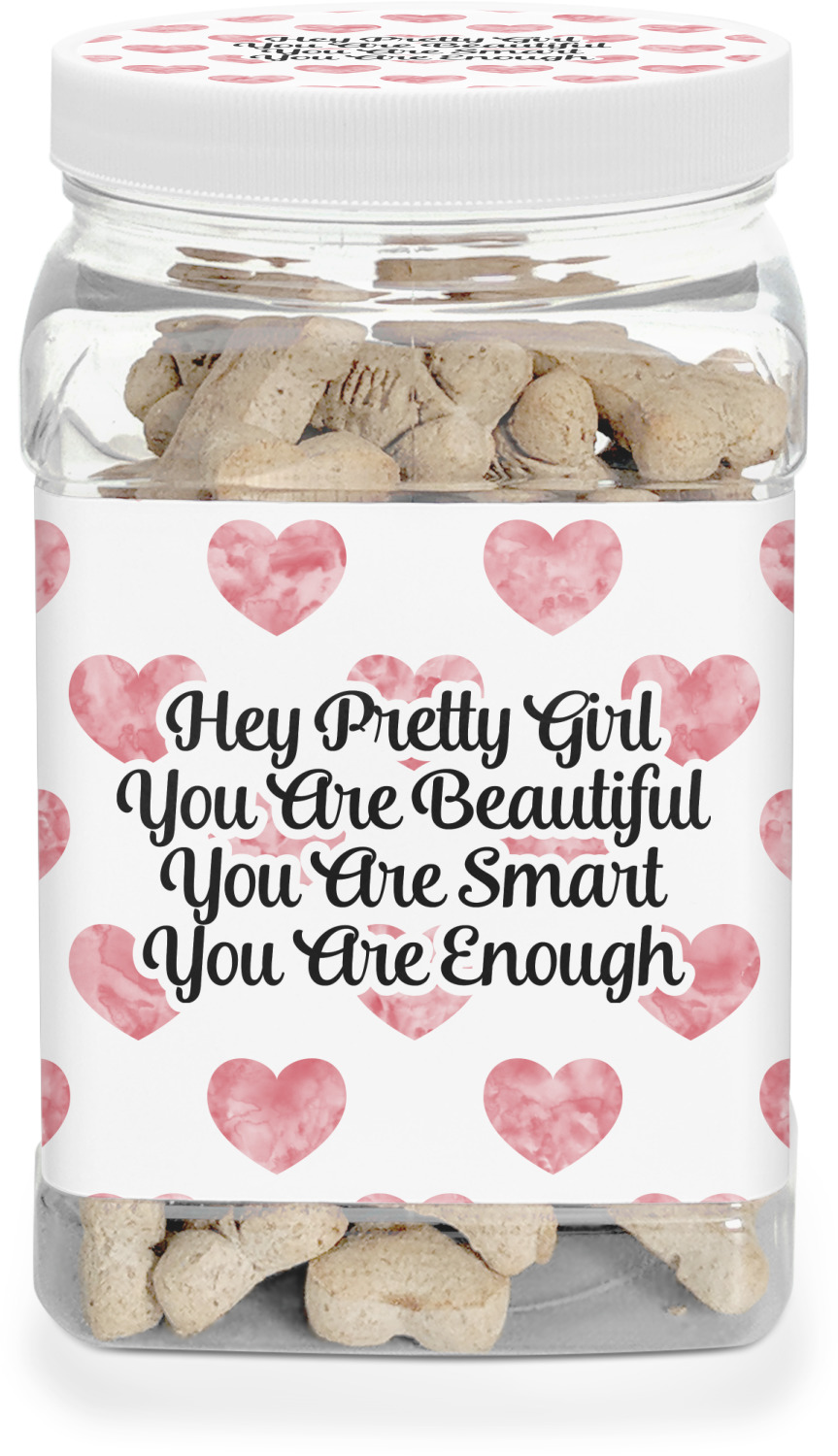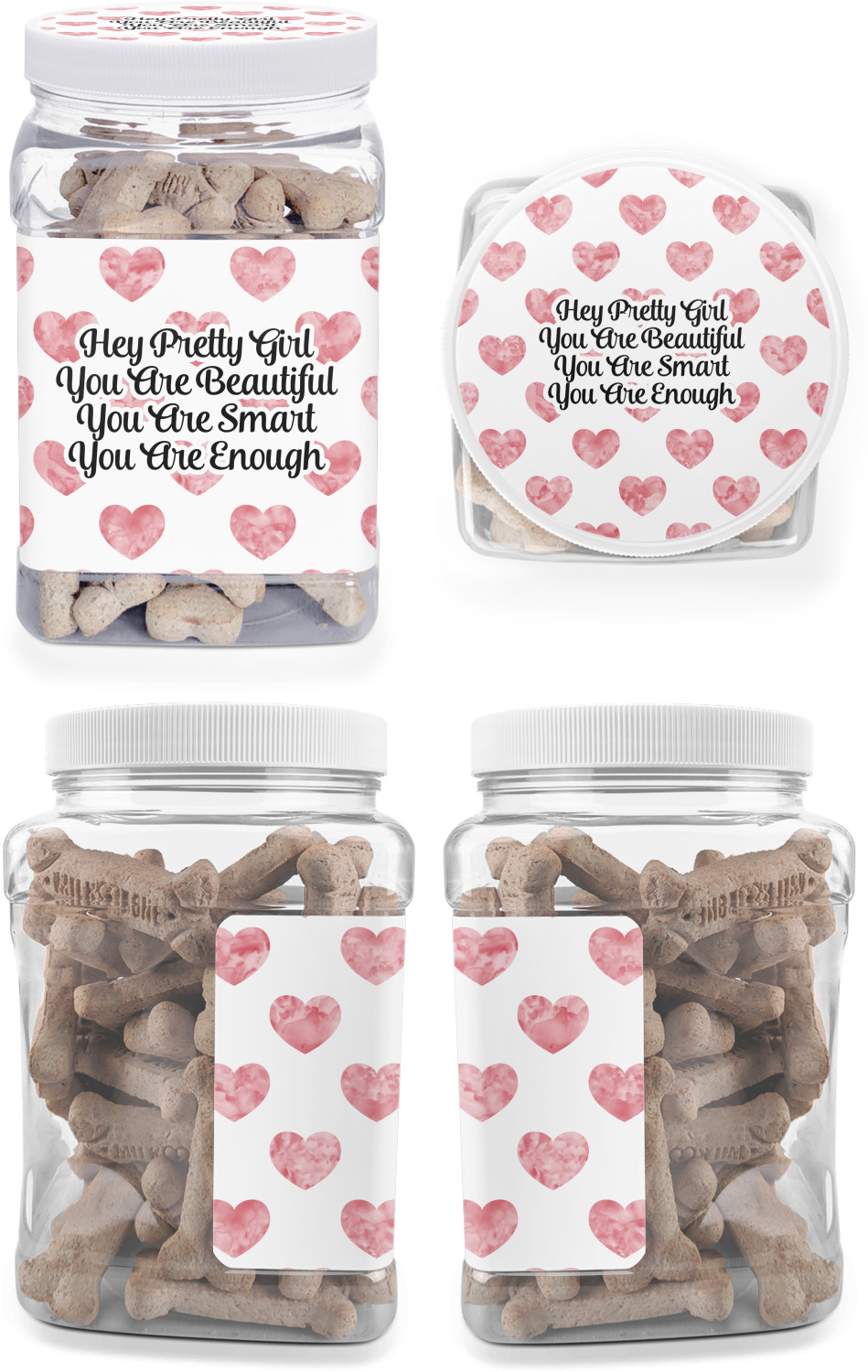 This half gallon jar, made from a sturdy plastic, is the perfect way to keep treats from any naughty pet paws, while still keeping them ready on hand for when your pup performs an impressive trick. This dog cookie jar features a screw-on, white lid that displays your personalized design on a vinyl sticker. We apply another customized sticker that wraps around the front and sides of the jar. Our dog treat jar also has indentations on the rear ends of the sides, which allows for convenient handling, and its square frame allows for easy storage.