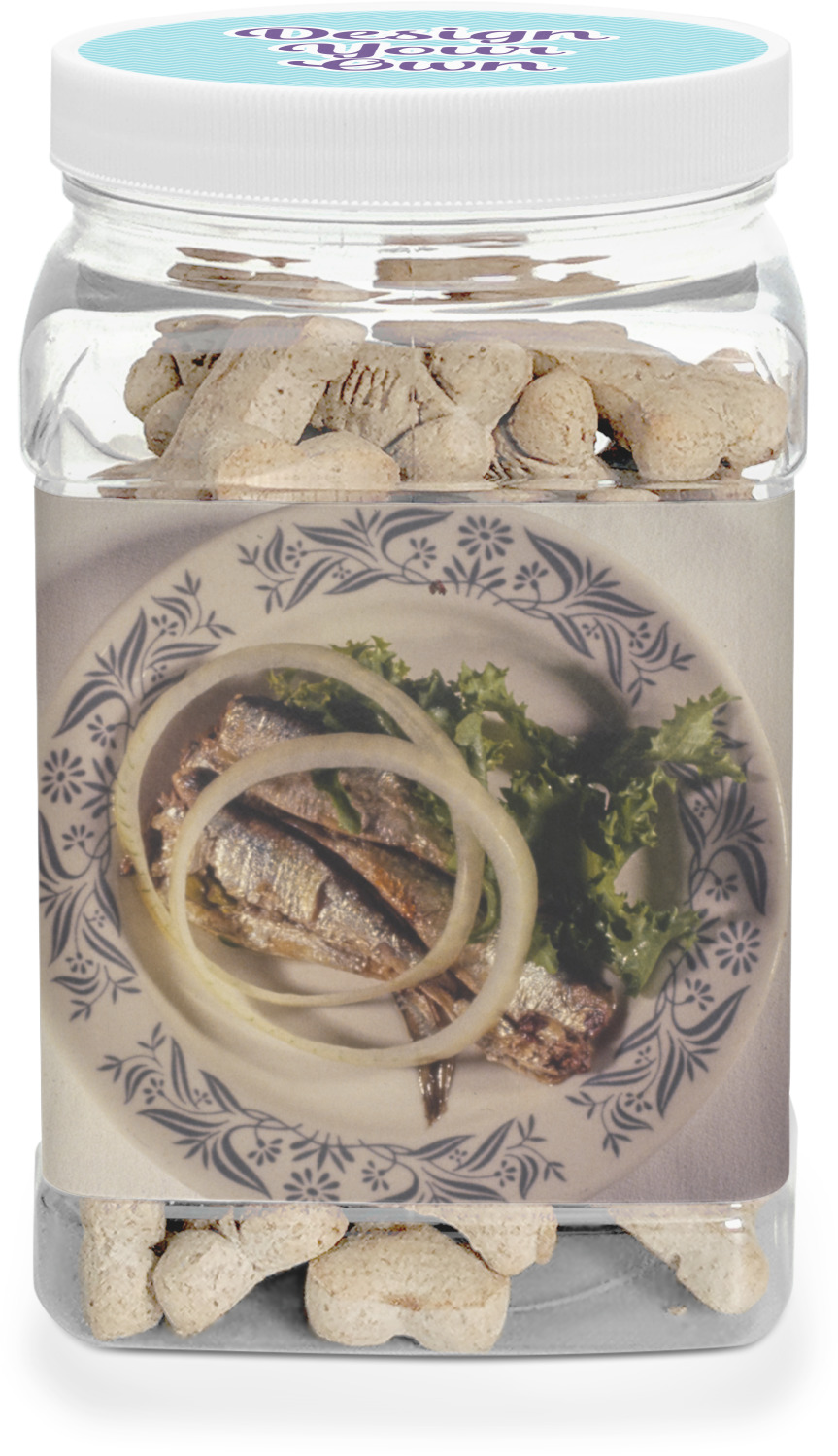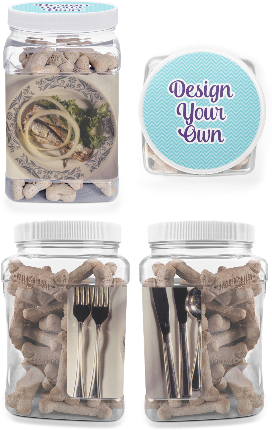 This half gallon jar, made from a sturdy plastic, is the perfect way to keep treats from any naughty pet paws, while still keeping them ready on hand for when your pup performs an impressive trick. This dog cookie jar features a screw-on, white lid that displays your personalized design on a vinyl sticker. We apply another customized sticker that wraps around the front and sides of the jar. Our dog treat jar also has indentations on the rear ends of the sides, which allows for convenient handling, and its square frame allows for easy storage.