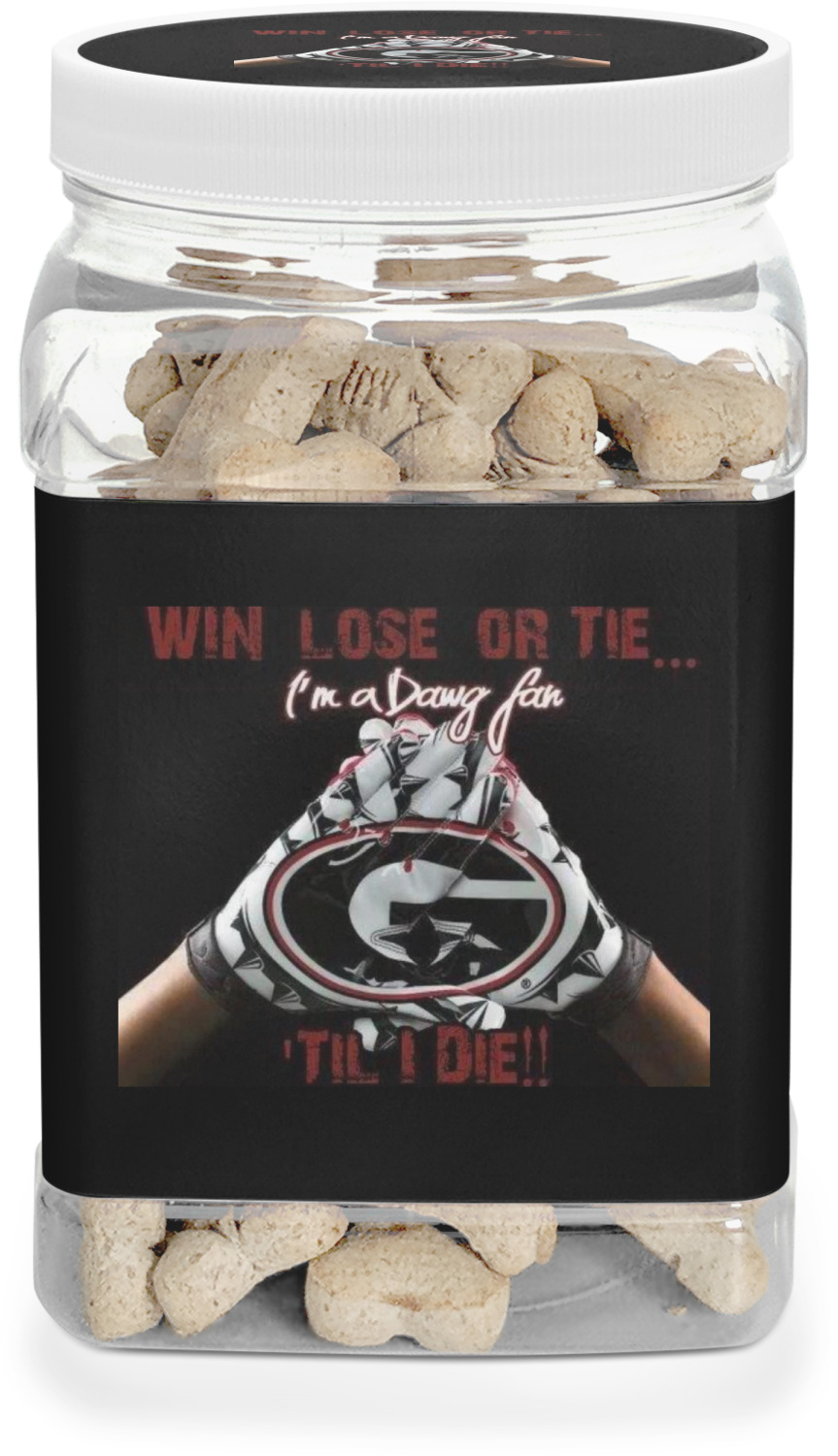 This half gallon jar, made from a sturdy plastic, is the perfect way to keep treats from any naughty pet paws, while still keeping them ready on hand for when your pup performs an impressive trick. This dog cookie jar features a screw-on, white lid that displays your personalized design on a vinyl sticker. We apply another customized sticker that wraps around the front and sides of the jar. Our dog treat jar also has indentations on the rear ends of the sides, which allows for convenient handling, and its square frame allows for easy storage.