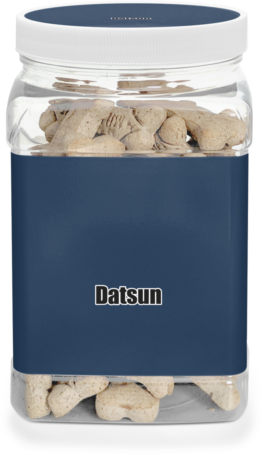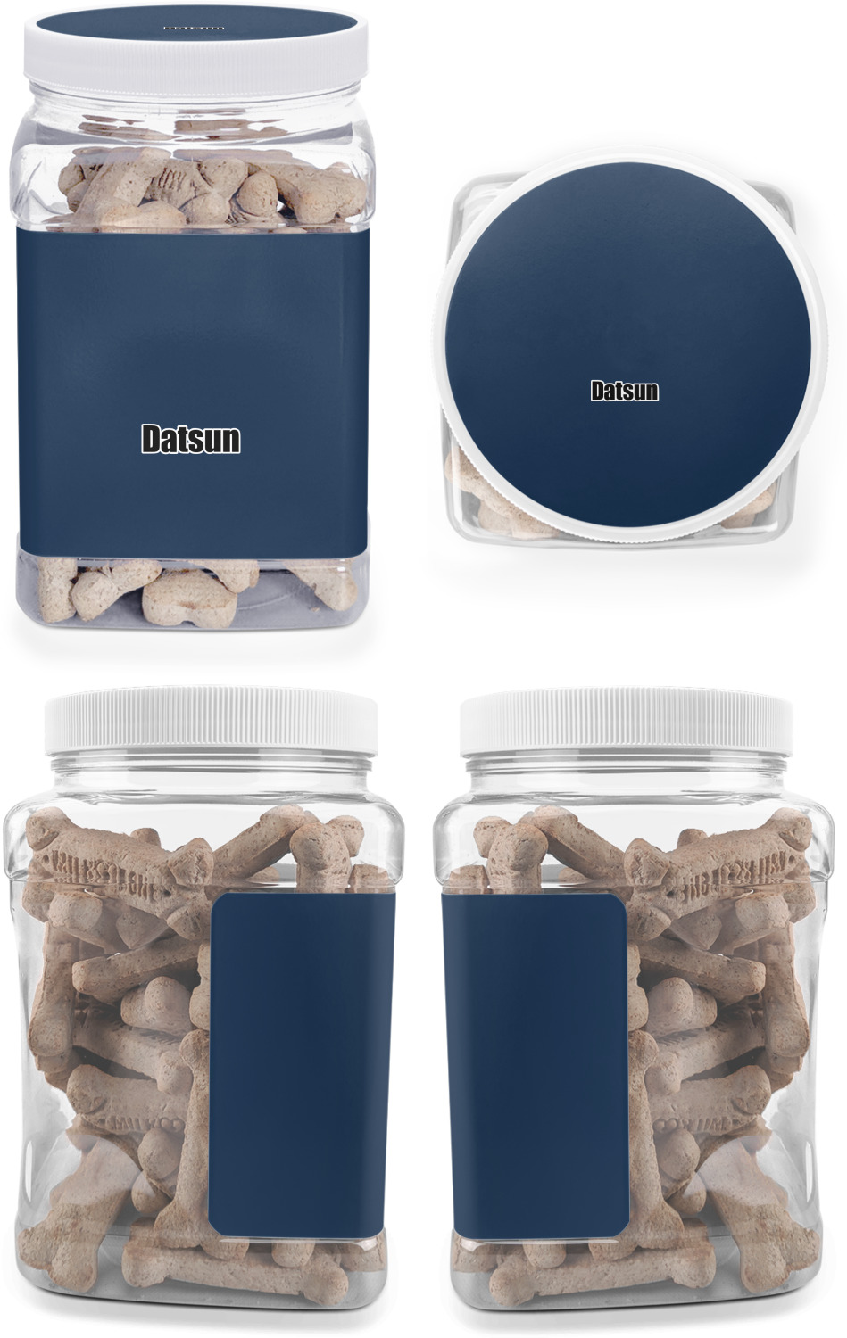 This half gallon jar, made from a sturdy plastic, is the perfect way to keep treats from any naughty pet paws, while still keeping them ready on hand for when your pup performs an impressive trick. This dog cookie jar features a screw-on, white lid that displays your personalized design on a vinyl sticker. We apply another customized sticker that wraps around the front and sides of the jar. Our dog treat jar also has indentations on the rear ends of the sides, which allows for convenient handling, and its square frame allows for easy storage.