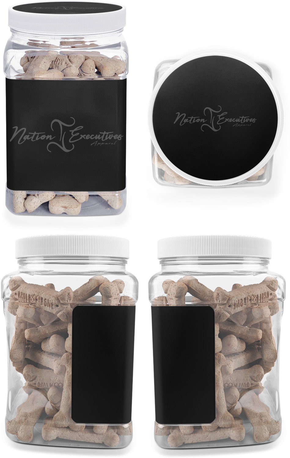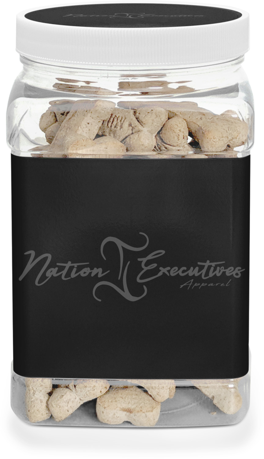 This half gallon jar, made from a sturdy plastic, is the perfect way to keep treats from any naughty pet paws, while still keeping them ready on hand for when your pup performs an impressive trick. This dog cookie jar features a screw-on, white lid that displays your personalized design on a vinyl sticker. We apply another customized sticker that wraps around the front and sides of the jar. Our dog treat jar also has indentations on the rear ends of the sides, which allows for convenient handling, and its square frame allows for easy storage.