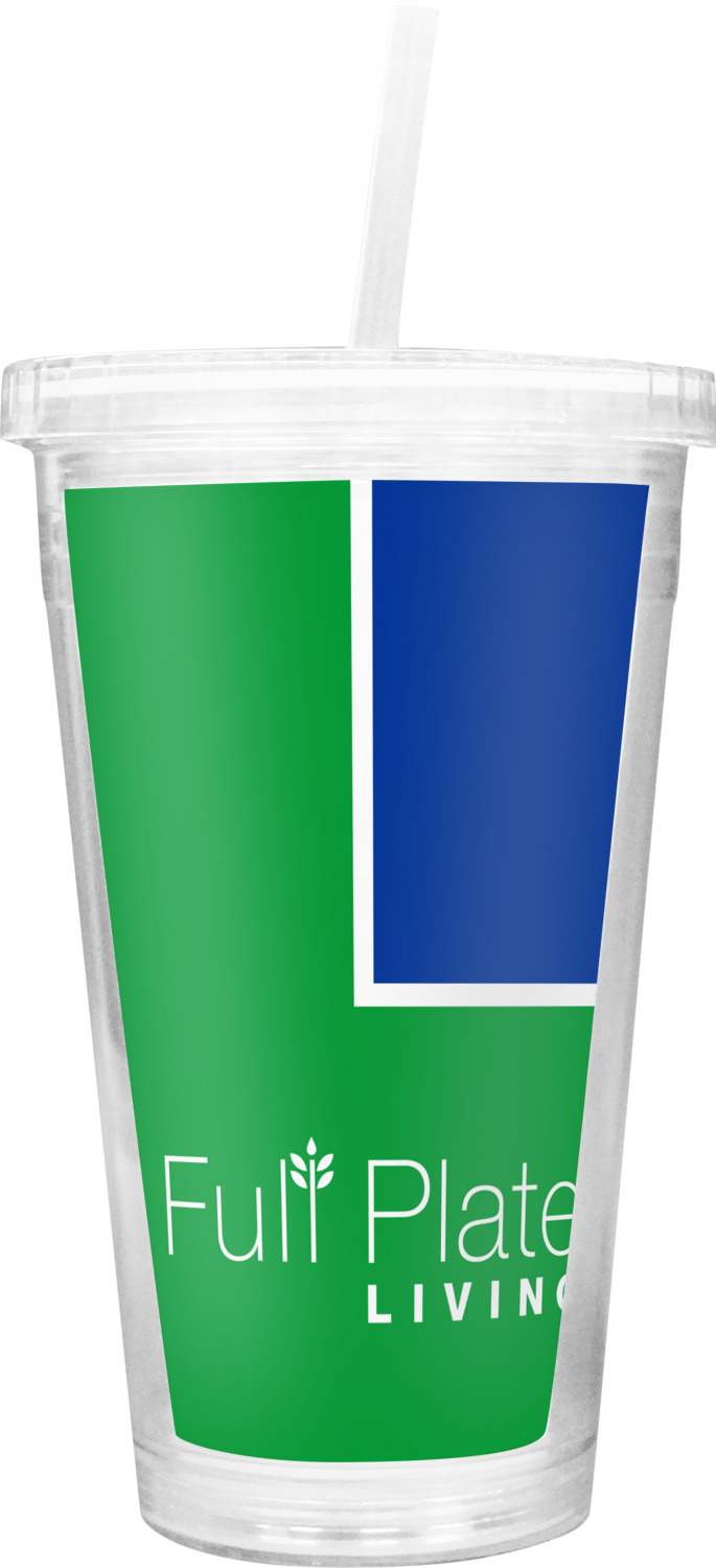 These BPA free tumblers with their double walls keep your drink cold and will not sweat on the outside; they have a clear acrylic top and a reusable straw with a ring around the bottom to keep the straw from falling out.