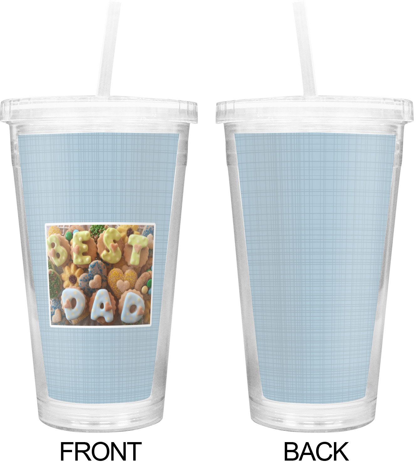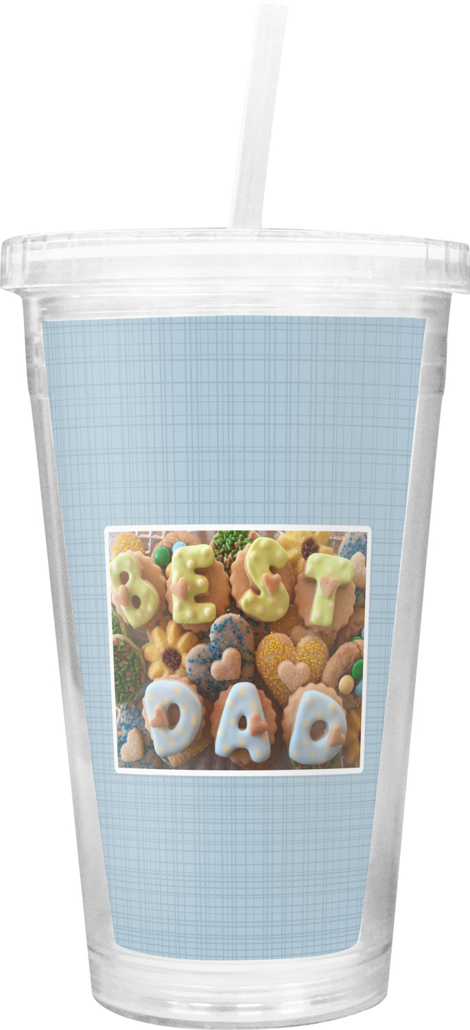 These BPA free tumblers with their double walls keep your drink cold and will not sweat on the outside; they have a clear acrylic top and a reusable straw with a ring around the bottom to keep the straw from falling out.