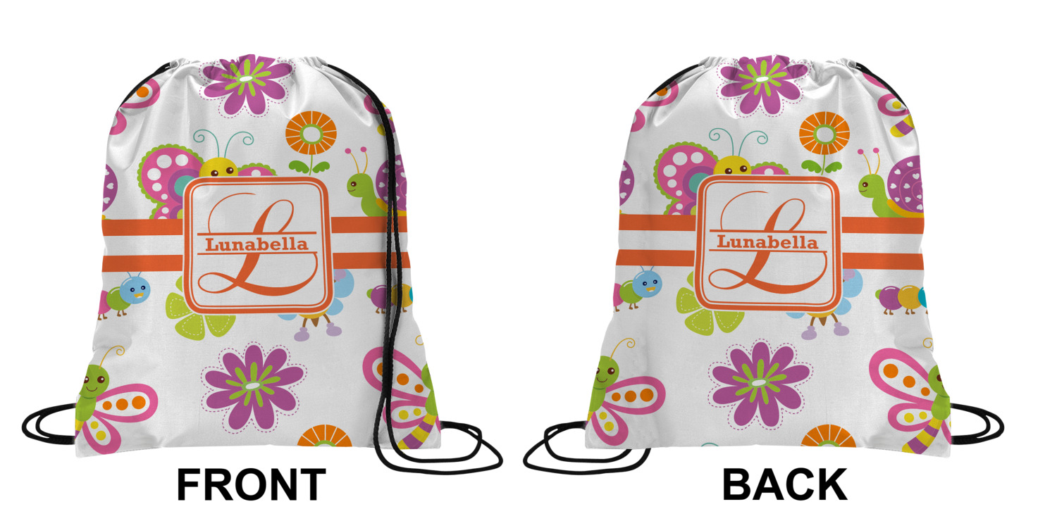 Your custom design will appear on the front and the back of the backpack. You can customize each side individually. The inside of the backpack is white and the drawstrings are black. The back pack is made of 100% polyester fabric.