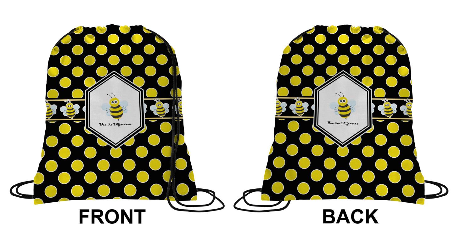 Your custom design will appear on the front and the back of the backpack. You can customize each side individually. The inside of the backpack is white and the drawstrings are black. The back pack is made of 100% polyester fabric.