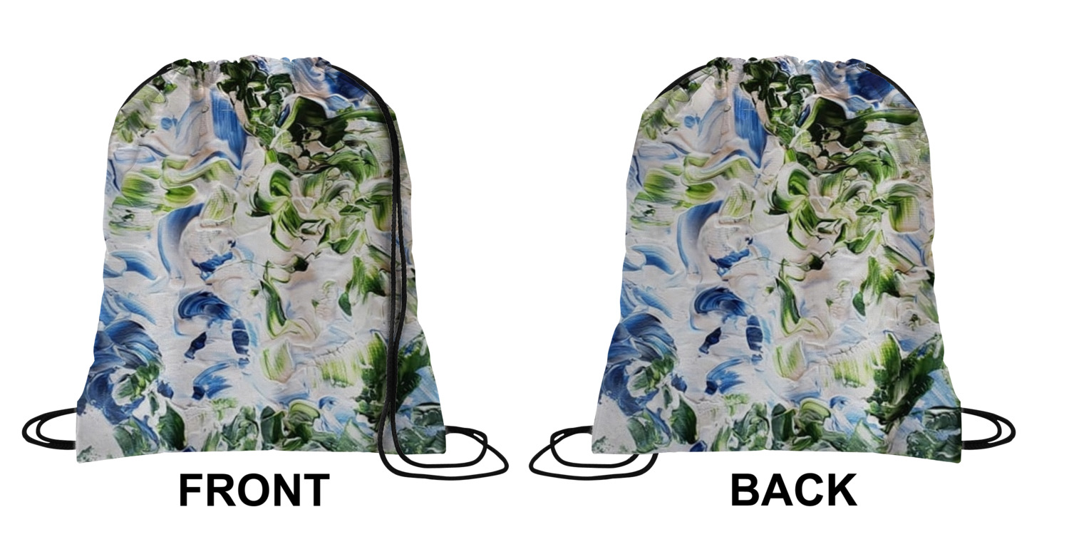 Your custom design will appear on the front and the back of the backpack. You can customize each side individually. The inside of the backpack is white and the drawstrings are black. The back pack is made of 100% polyester fabric.