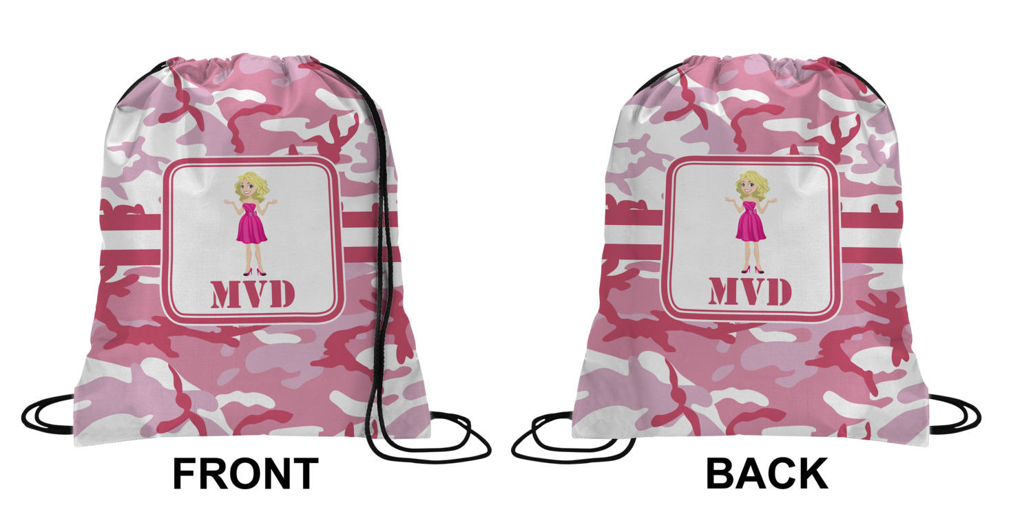 Your custom design will appear on the front and the back of the backpack. You can customize each side individually. The inside of the backpack is white and the drawstrings are black. The back pack is made of 100% polyester fabric.