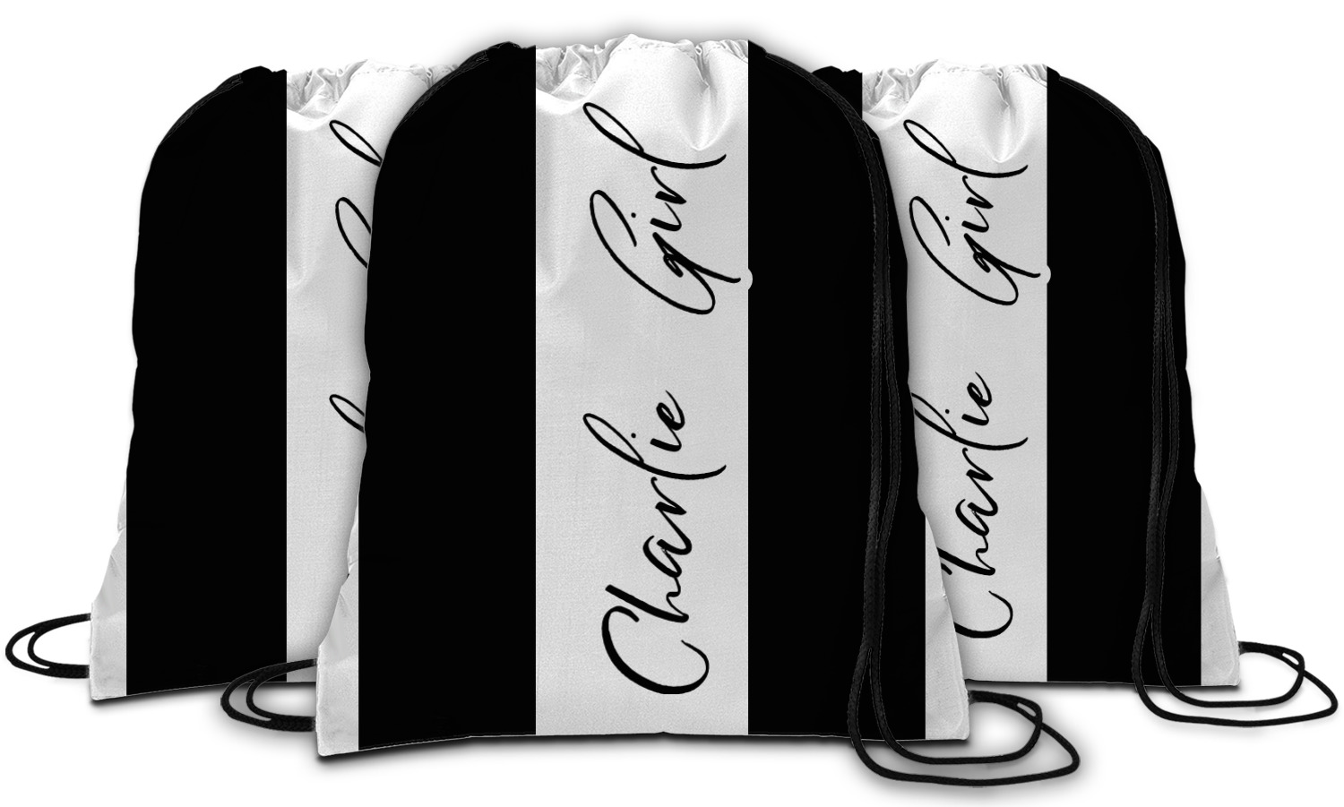 Your custom design will appear on the front and the back of the backpack. You can customize each side individually. The inside of the backpack is white and the drawstrings are black. The back pack is made of 100% polyester fabric.