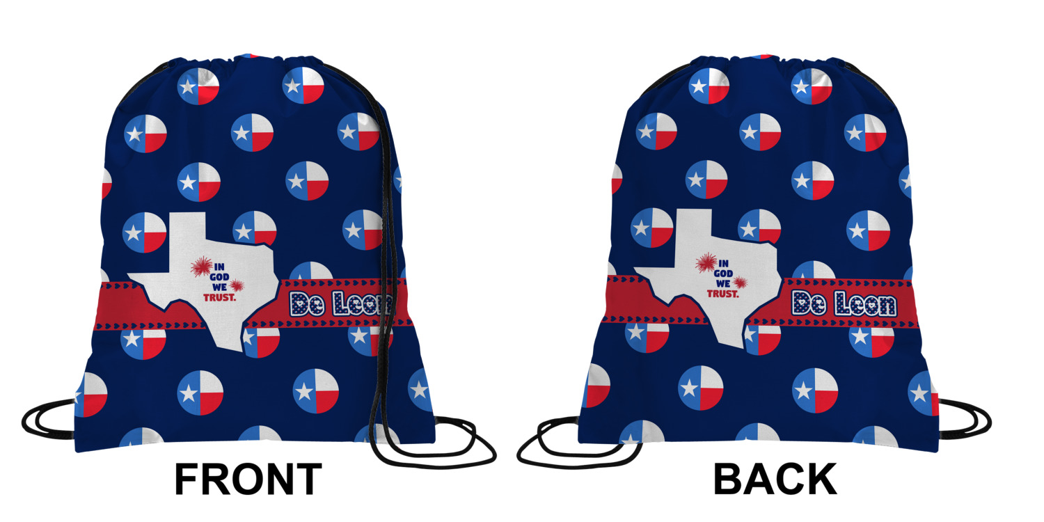 Your custom design will appear on the front and the back of the backpack. You can customize each side individually. The inside of the backpack is white and the drawstrings are black. The back pack is made of 100% polyester fabric.