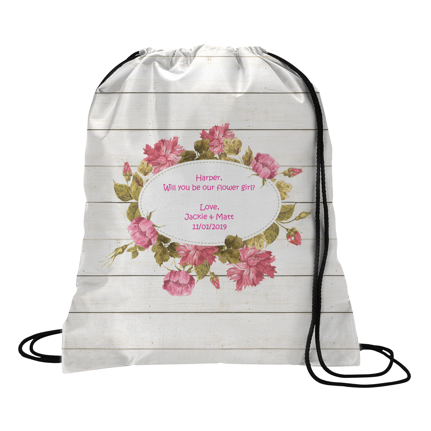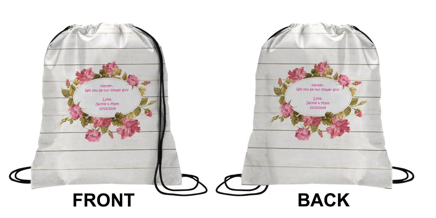 Your custom design will appear on the front and the back of the backpack. You can customize each side individually. The inside of the backpack is white and the drawstrings are black. The back pack is made of 100% polyester fabric.