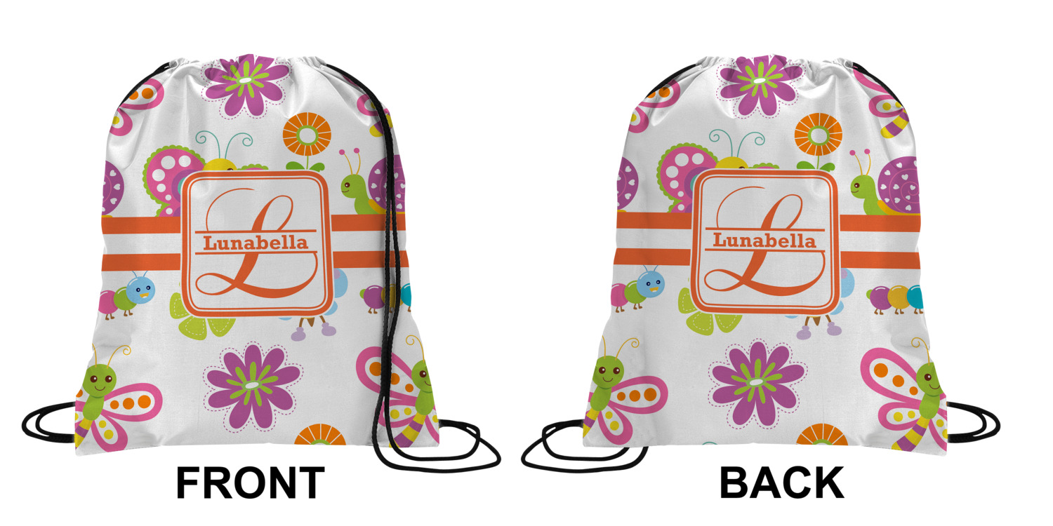 Your custom design will appear on the front and the back of the backpack. You can customize each side individually. The inside of the backpack is white and the drawstrings are black. The back pack is made of 100% polyester fabric.