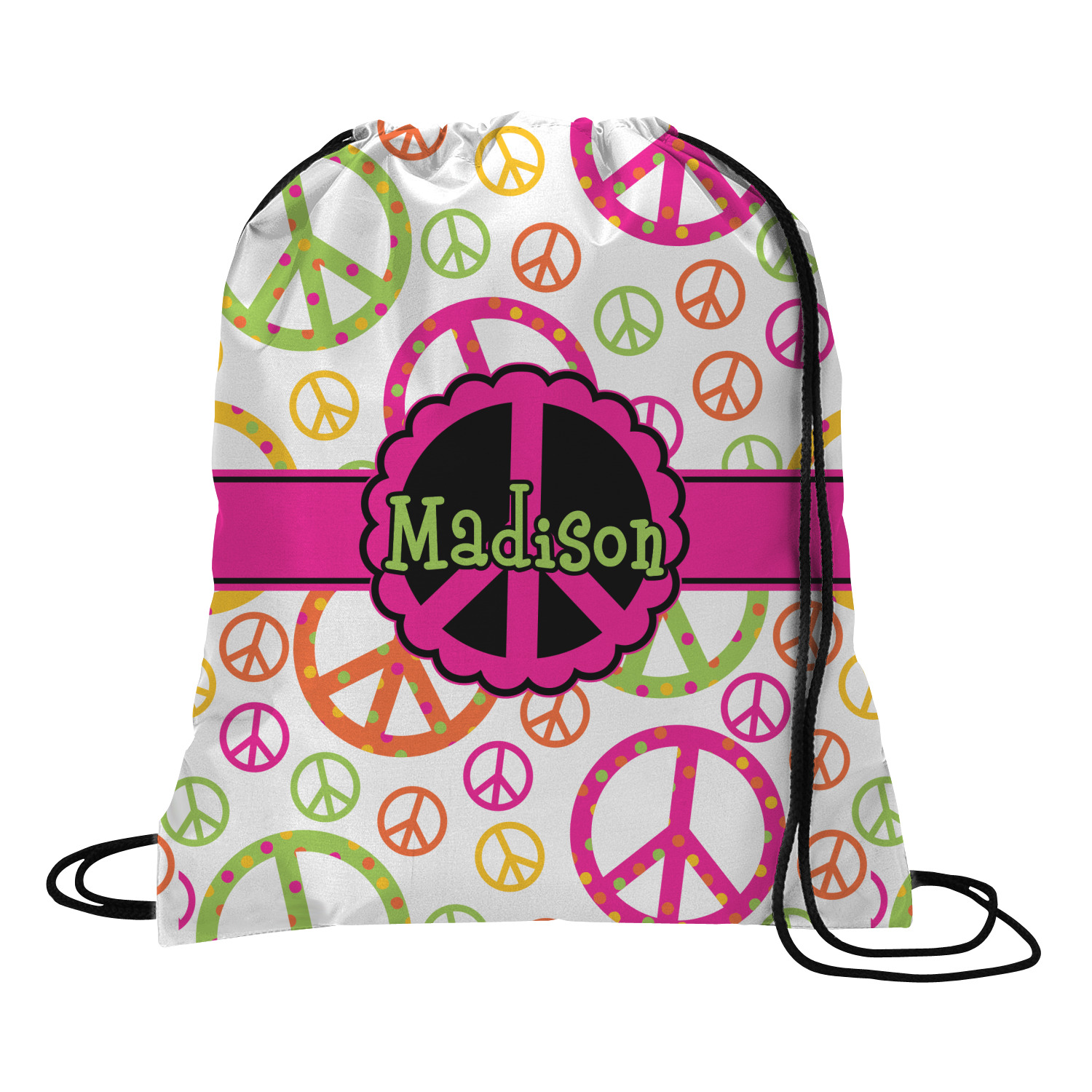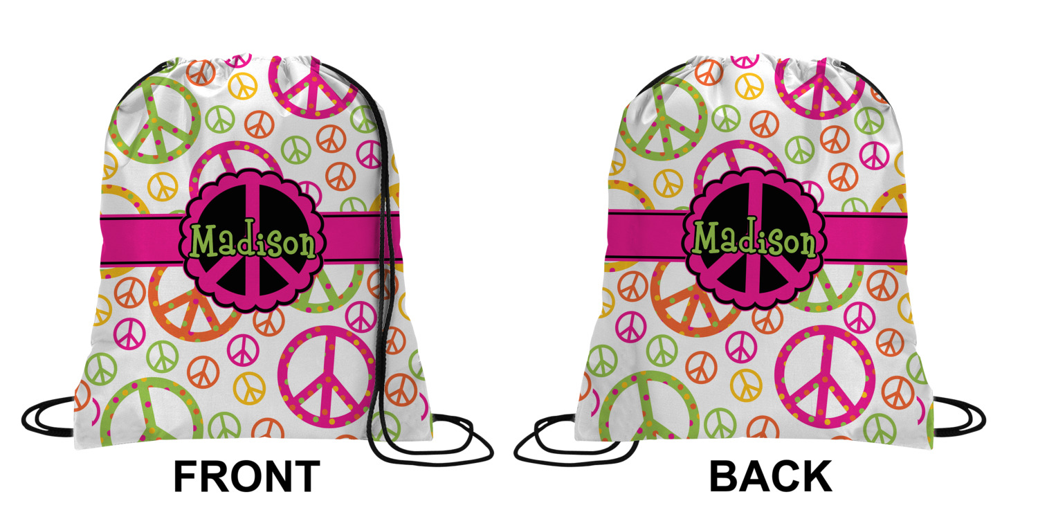 Your custom design will appear on the front and the back of the backpack. You can customize each side individually. The inside of the backpack is white and the drawstrings are black. The back pack is made of 100% polyester fabric.