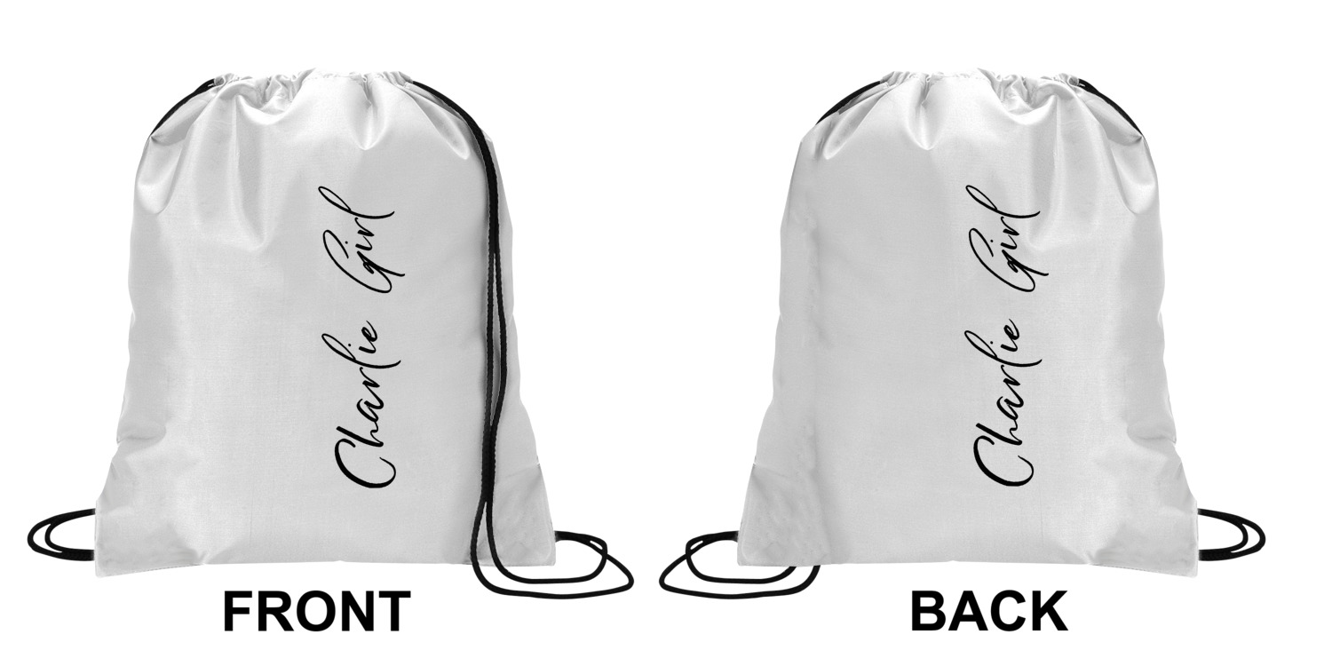 Your custom design will appear on the front and the back of the backpack. You can customize each side individually. The inside of the backpack is white and the drawstrings are black. The back pack is made of 100% polyester fabric.