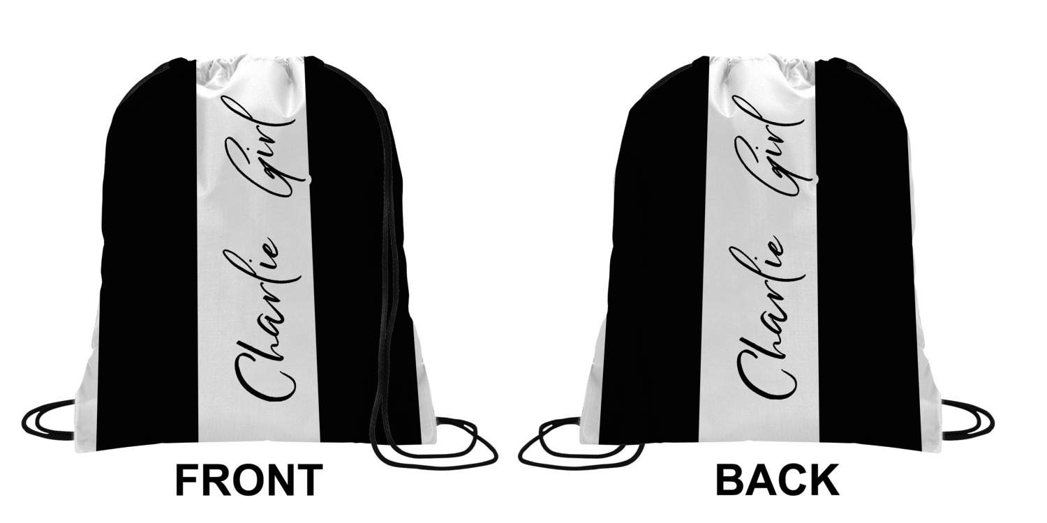 Your custom design will appear on the front and the back of the backpack. You can customize each side individually. The inside of the backpack is white and the drawstrings are black. The back pack is made of 100% polyester fabric.