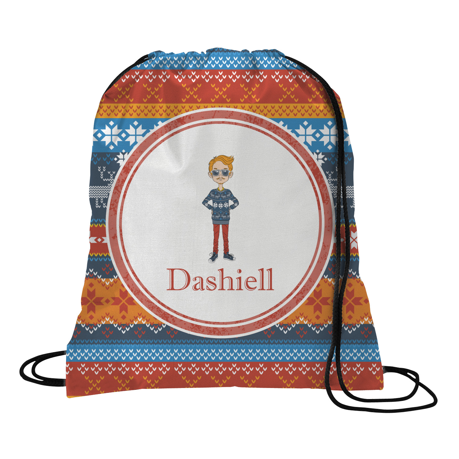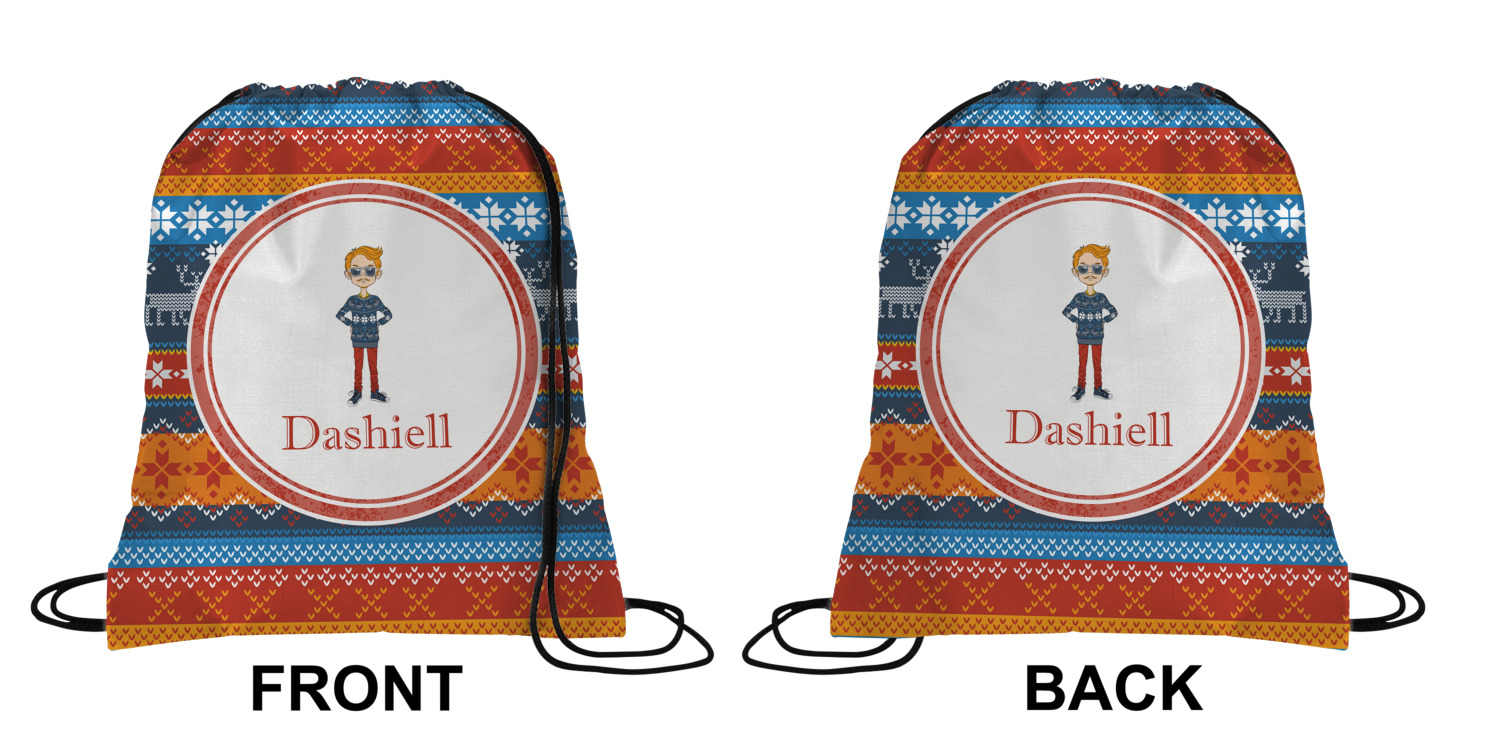 Your custom design will appear on the front and the back of the backpack. You can customize each side individually. The inside of the backpack is white and the drawstrings are black. The back pack is made of 100% polyester fabric.