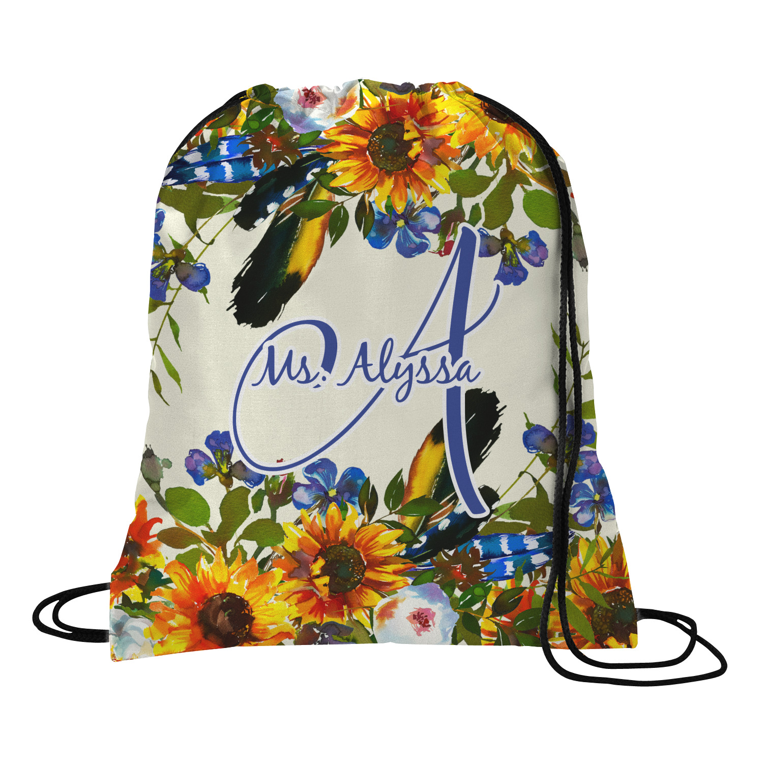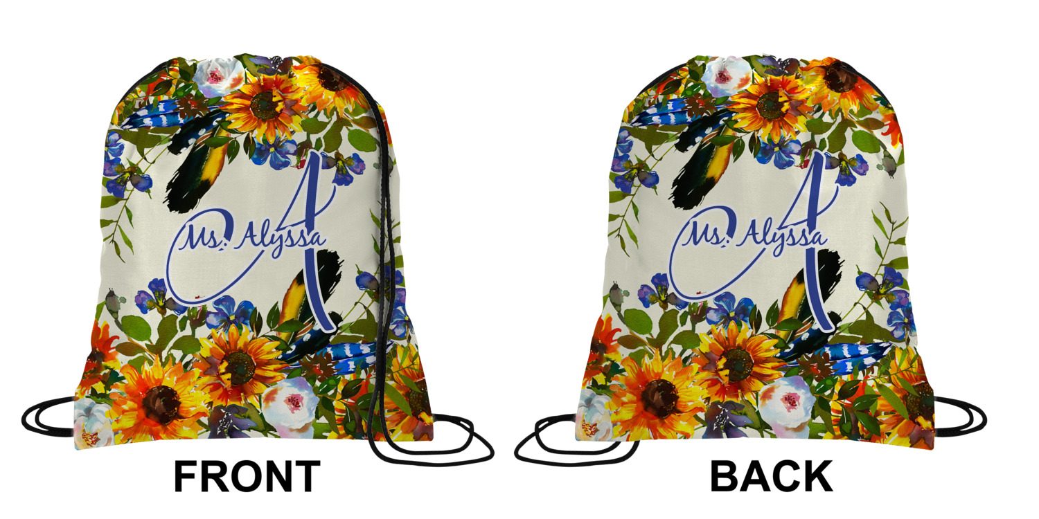 Your custom design will appear on the front and the back of the backpack. You can customize each side individually. The inside of the backpack is white and the drawstrings are black. The back pack is made of 100% polyester fabric.