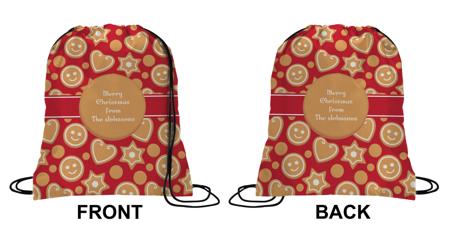 Your custom design will appear on the front and the back of the backpack. You can customize each side individually. The inside of the backpack is white and the drawstrings are black. The back pack is made of 100% polyester fabric.