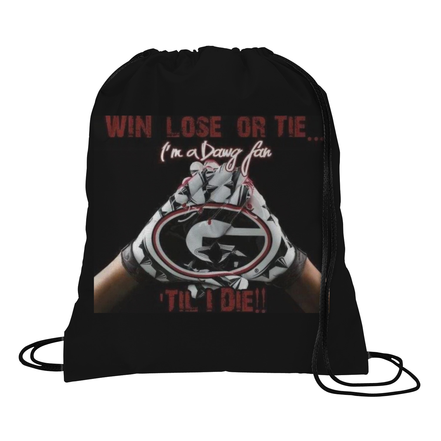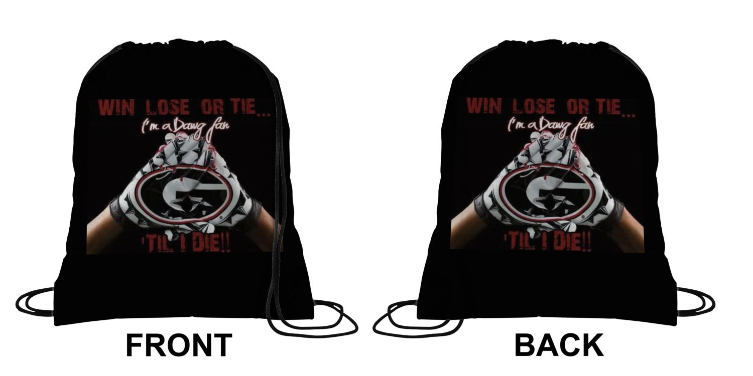 Your custom design will appear on the front and the back of the backpack. You can customize each side individually. The inside of the backpack is white and the drawstrings are black. The back pack is made of 100% polyester fabric.