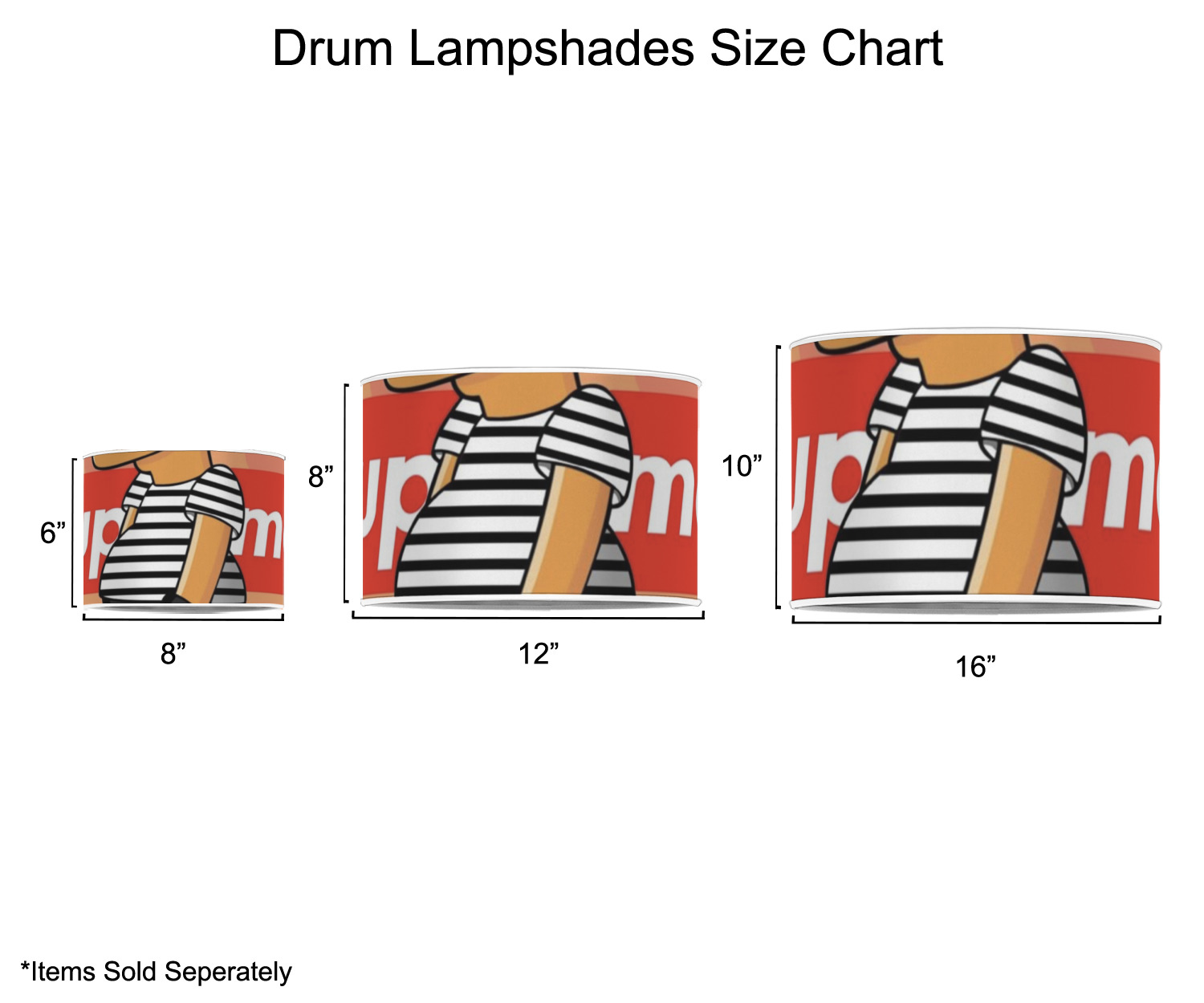 Our customized lamp shades also come in 3 different sizes: 8", 12" and 16", measuring at 8" in diameter by 6" tall, 12" in diameter by 8" tall, and 16" in diameter by 10" tall, respectively.