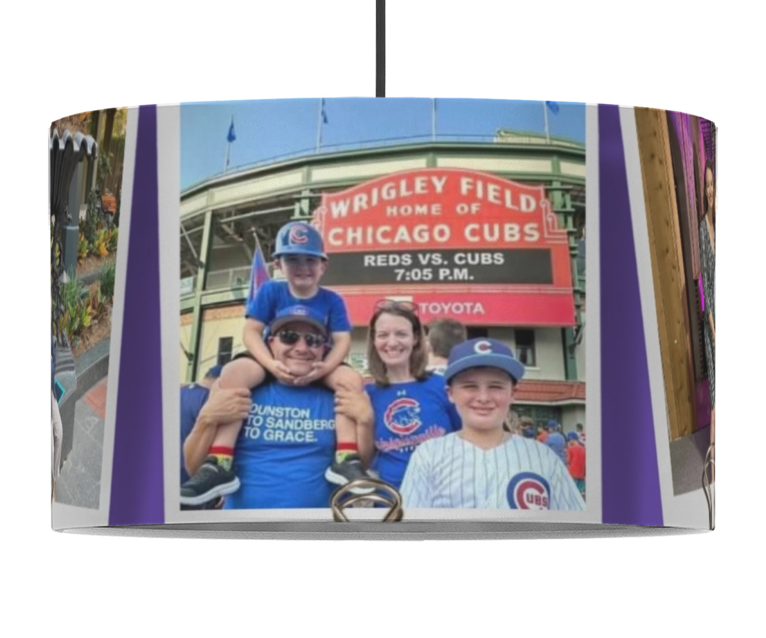 These pendant lampshades are in a cylindrical, drum shape. Available in 2 sizes - 16 inch diameter and a height of 10 inches or 12 inch diameter with a height of 8 inches, this lantern pendant light will not go unnoticed in your home. The interior of this light shade is made of flexible, smooth plastic, and the base color of the lamp is white. Your personalization is displayed on the exterior of this custom lampshade. The fabric shades the fabric fully wraps the ring for a sleek look. Your purchase includes a 12 foot long cord that has a convenient on and off switch attached, the cord is black in color with a tasteful cloth covering over the cord to add the sophisticated look to this light fixture. This lamp can fit a 60 or 75 watt light bulb, but the bulb is not included. Please scroll through the images above to learn more about the structure and shaping of this lamp compared to the other ones we offer.