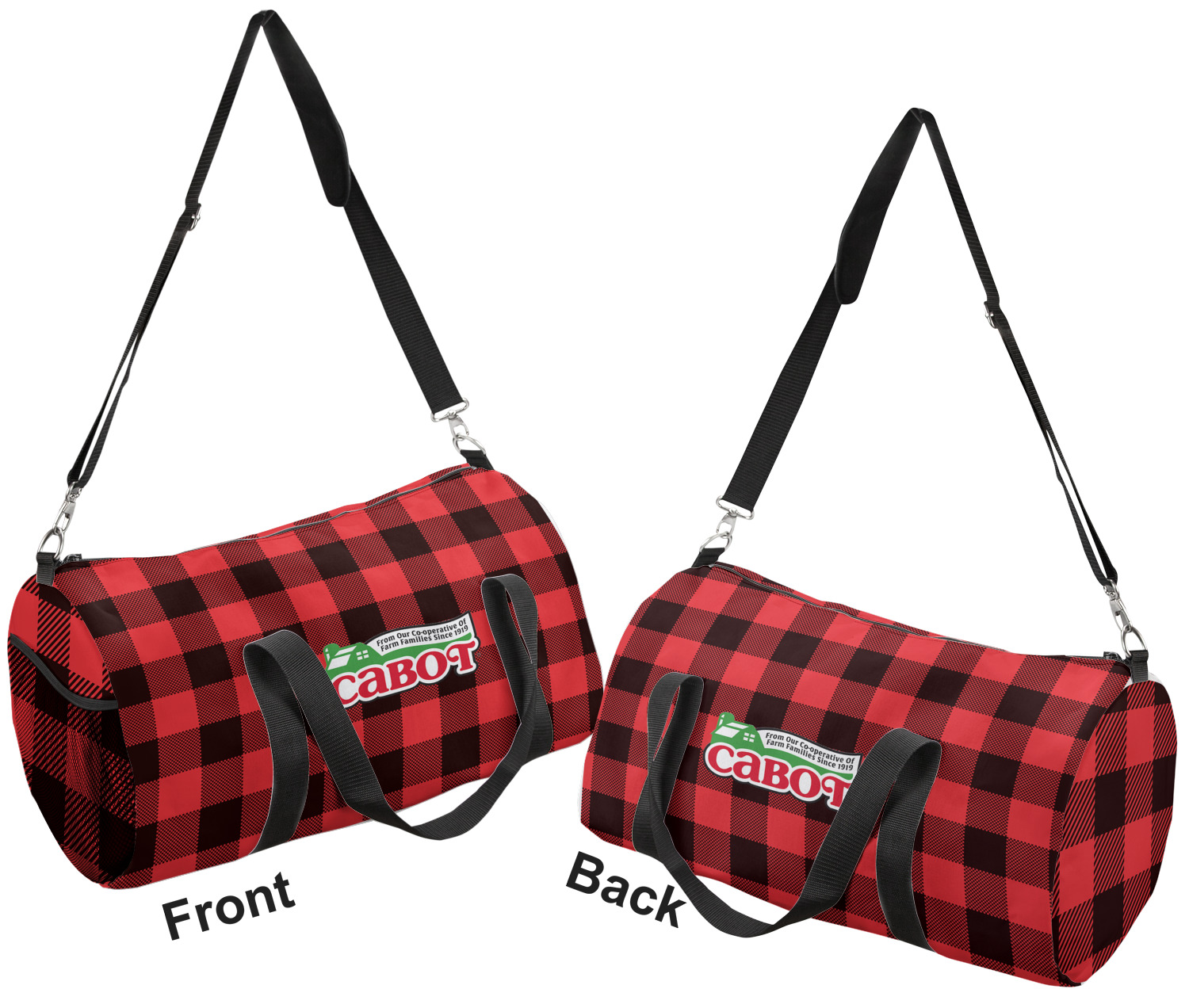 This duffle is a sturdy bag made of a canvas material. It comes in two sizes: Small (19"W x 9.5"H x 9.5"D) and Large (23"W x 12"H x 12"D). The bag is a cylindrical shape with a black adjustable strap and two handles. On one side is an elastic pouch to put a waterbottle or other small item. Your product will be sublimated with your design and is able to be designed on the front, back, and sides. Be sure to remember that the straps may cut into parts of your design if you upload your own artwork.