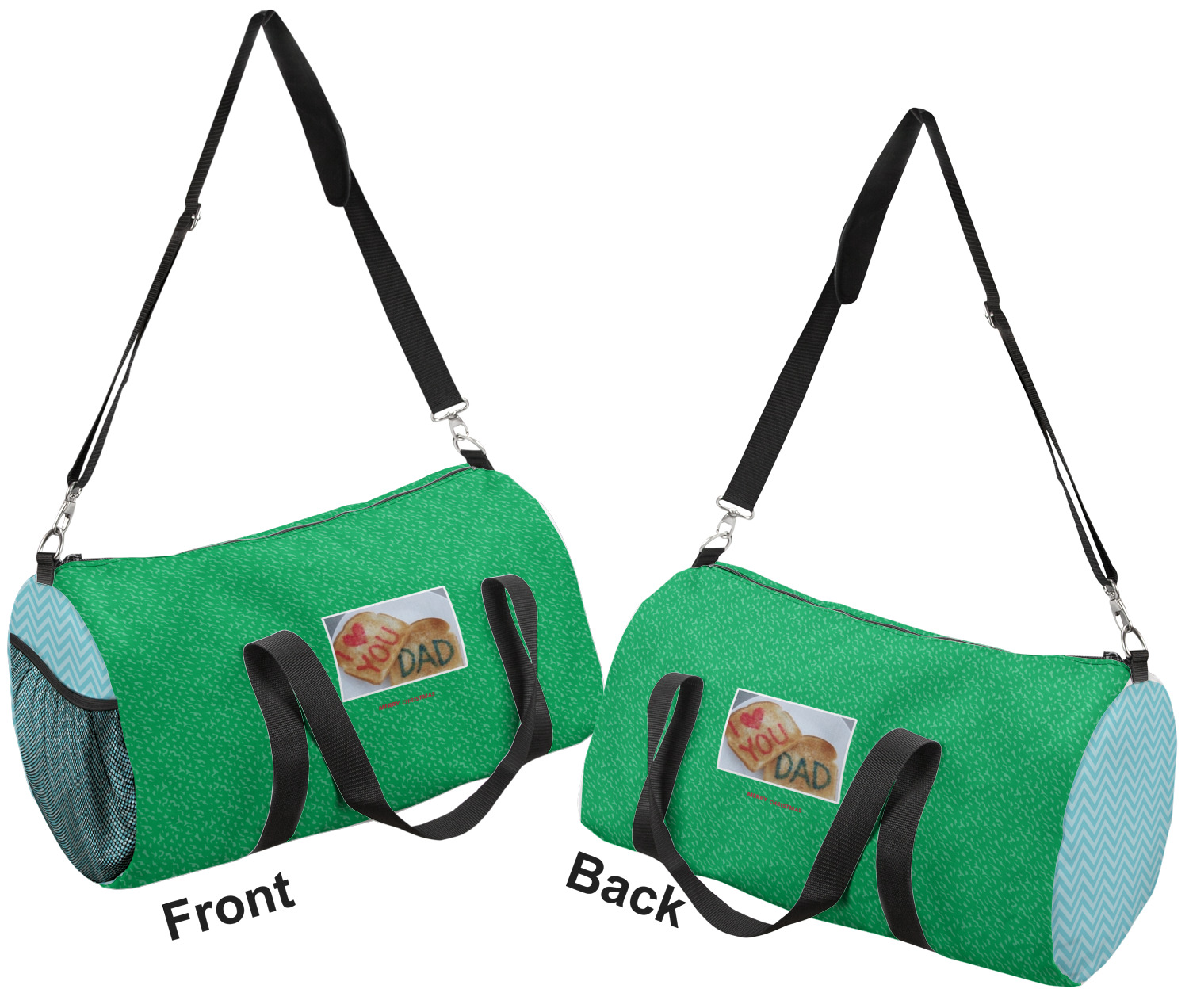 This duffle is a sturdy bag made of a canvas material. It comes in two sizes: Small (19"W x 9.5"H x 9.5"D) and Large (23"W x 12"H x 12"D). The bag is a cylindrical shape with a black adjustable strap and two handles. On one side is an elastic pouch to put a waterbottle or other small item. Your product will be sublimated with your design and is able to be designed on the front, back, and sides. Be sure to remember that the straps may cut into parts of your design if you upload your own artwork.
