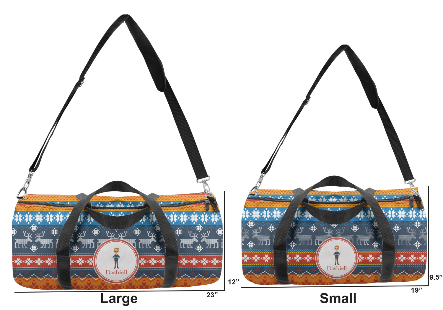 This duffle is a sturdy bag made of a canvas material. It comes in two sizes: Small (19"W x 9.5"H x 9.5"D) and Large (23"W x 12"H x 12"D). The bag is a cylindrical shape with a black adjustable strap and two handles. On one side is an elastic pouch to put a waterbottle or other small item. Your product will be sublimated with your design and is able to be designed on the front, back, and sides. Be sure to remember that the straps may cut into parts of your design if you upload your own artwork.